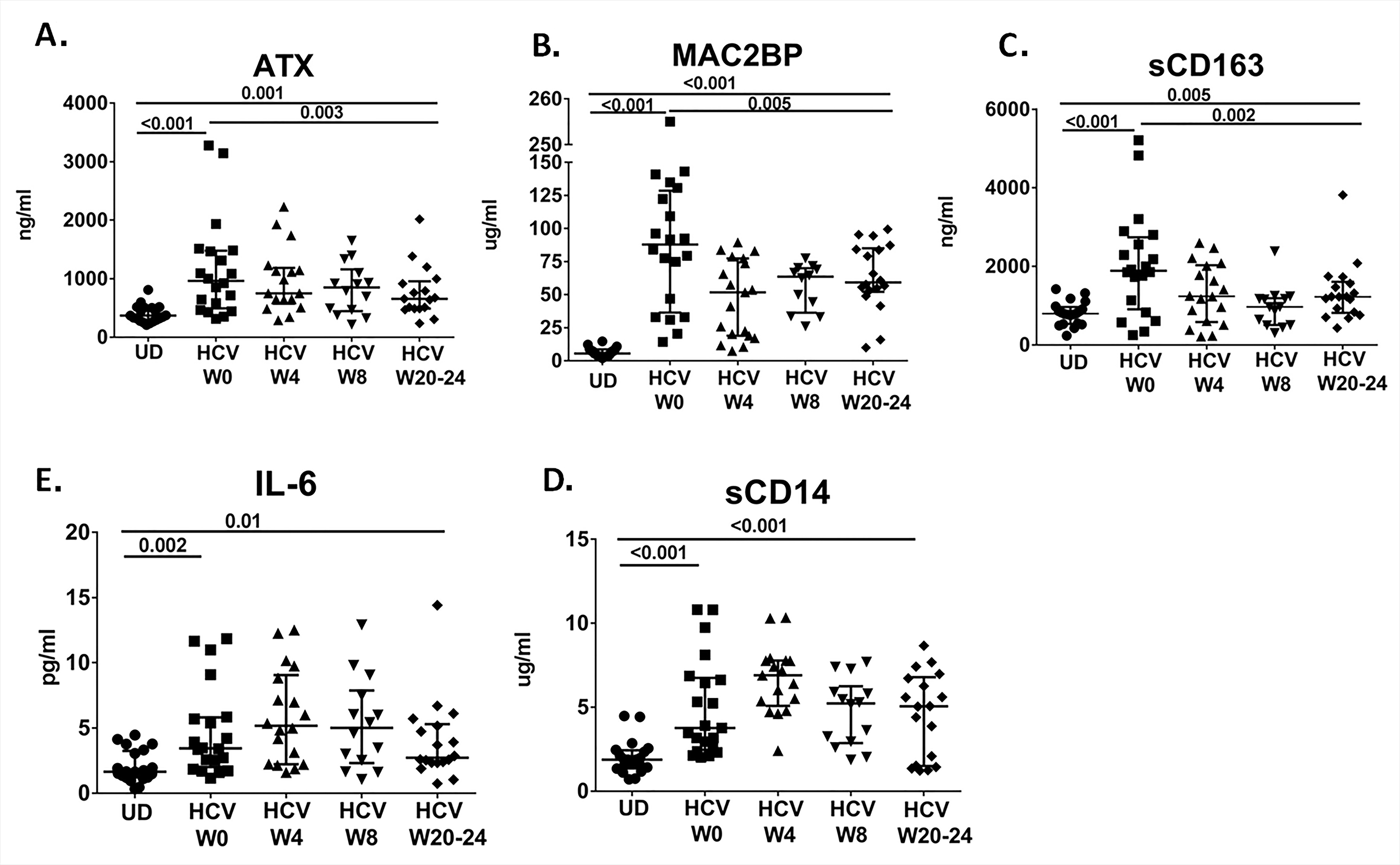 Figure 2. Partial normalization of inflammatory parameters over the course of IFN-free DAA therapy. Plasma levels of A) Autotaxin (ATX), B) Mac2BP, C) sCD163, D) IL-6 and E) sCD14 are shown over the course of IFN-free DAA therapy in HCV-infected participants (W0, W4, W8, and W20-24). Also shown are levels of each soluble factor for uninfected donors (UD).