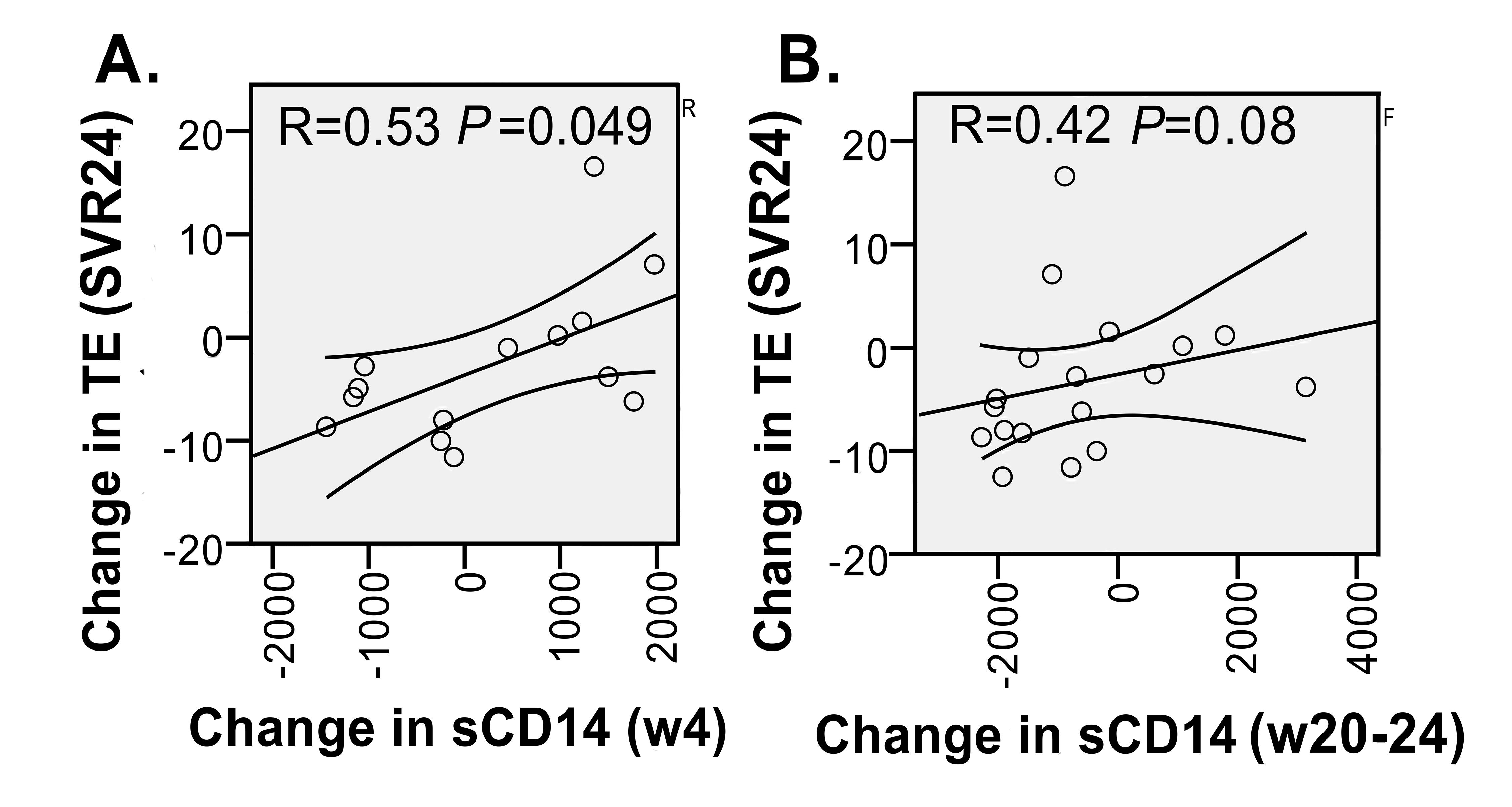 Figure 3. Correlation between change in sCD14 and change in TE score over the course of IFN-free therapy. A) Change in sCD14 (week 4 [w4]-baseline) vs Change in TE score (SVR24 or 24 weeks post therapy-baseline). B) Change in sCD14 (week 20-24 [w20-24]-baseline) vs Change in TE score (SVR24 or 24 weeks post therapy-baseline). Spearman rank correlation coefficient and P value are shown in each panel and 95% confidence intervals.