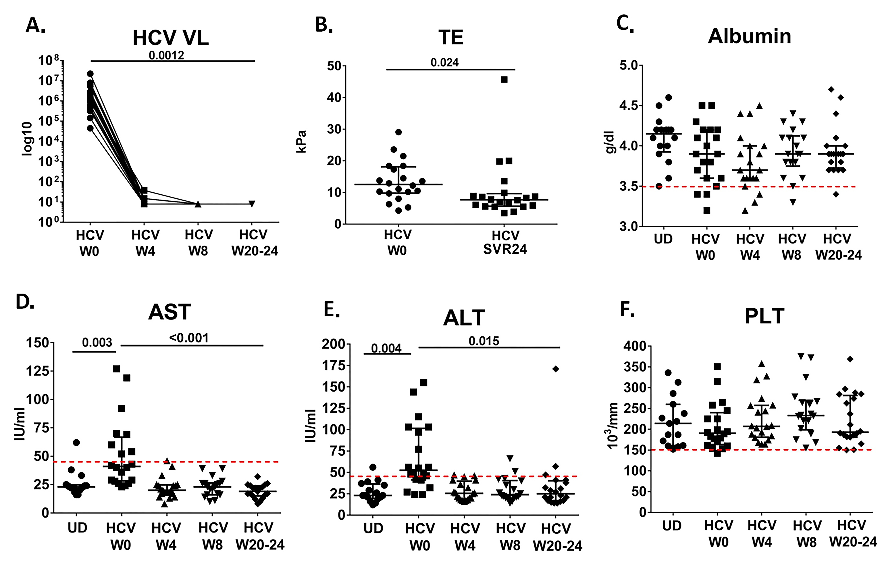 Figure 1. Normalization of clinical parameters over the course of IFN-free DAA therapy. A) Plasma HCV viral level is not detectable (lower limit of detection 15 IU/ml) at week 4 after starting DAA therapy. Log10 HCV viral level is shown over time after start of HCV DAA therapy at week 0 (w0). B) TE score (significantly decreases at week 24 after completion of DAA therapy SVR24 (P = 0.024). C) Albumin level over course of therapy in HCV-infected cohort as well as at 1 time point in uninfected donors (UD). Red dotted line indicates lower limit of normal. D) AST level over course of therapy in HCV-infected cohort (W0, W4, W8, and W20-24) as well as at 1 time point in uninfected donors (UD). Red dotted line indicates upper limit of normal. E) ALT level over course of therapy in HCV-infected cohort as well as at 1 time point in uninfected donors (UD). Red dotted line indicates upper limit of normal. F) PLT level over course of therapy in HCV-infected cohort as well as at 1 time point in uninfected donors. Red dotted line indicates lower limit of normal.