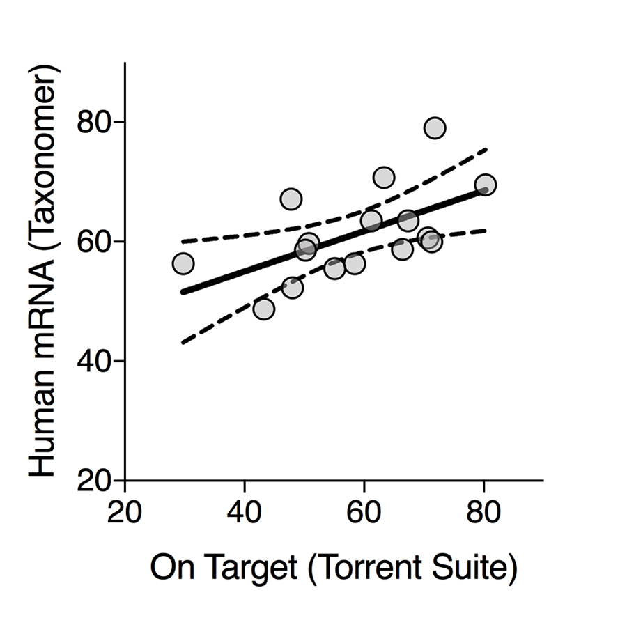 Libraries were prepared with the Ion AmpliSeq Transcriptome Human Gene Expression kit (Thermo Fisher Scientific, version 1) using 10 or 100 ng of total RNA, depending on human mRNA abundance. Commercial human RNA was used as control. Targets were amplified with the Ion AmpliSeq Transcriptome Human Gene Expression Core Panel targeting >20,000 genes, followed by partial digestion of primers, ligation of barcoded adapters, and library amplification for 18 cycles. Amplified libraries were eluted in 30 uL of low TE buffer after purification and quantified using the Ion Library TaqMan Quantitation Kit (Thermo Fisher Scientific). Libraries from 12 samples with ACTG1:16S ratios of above 10-4 were randomly selected for sequencing on the Ion Torrent Proton system using a P1 chip according to the manufacturer’s instructions (Thermo Fisher Scientific).