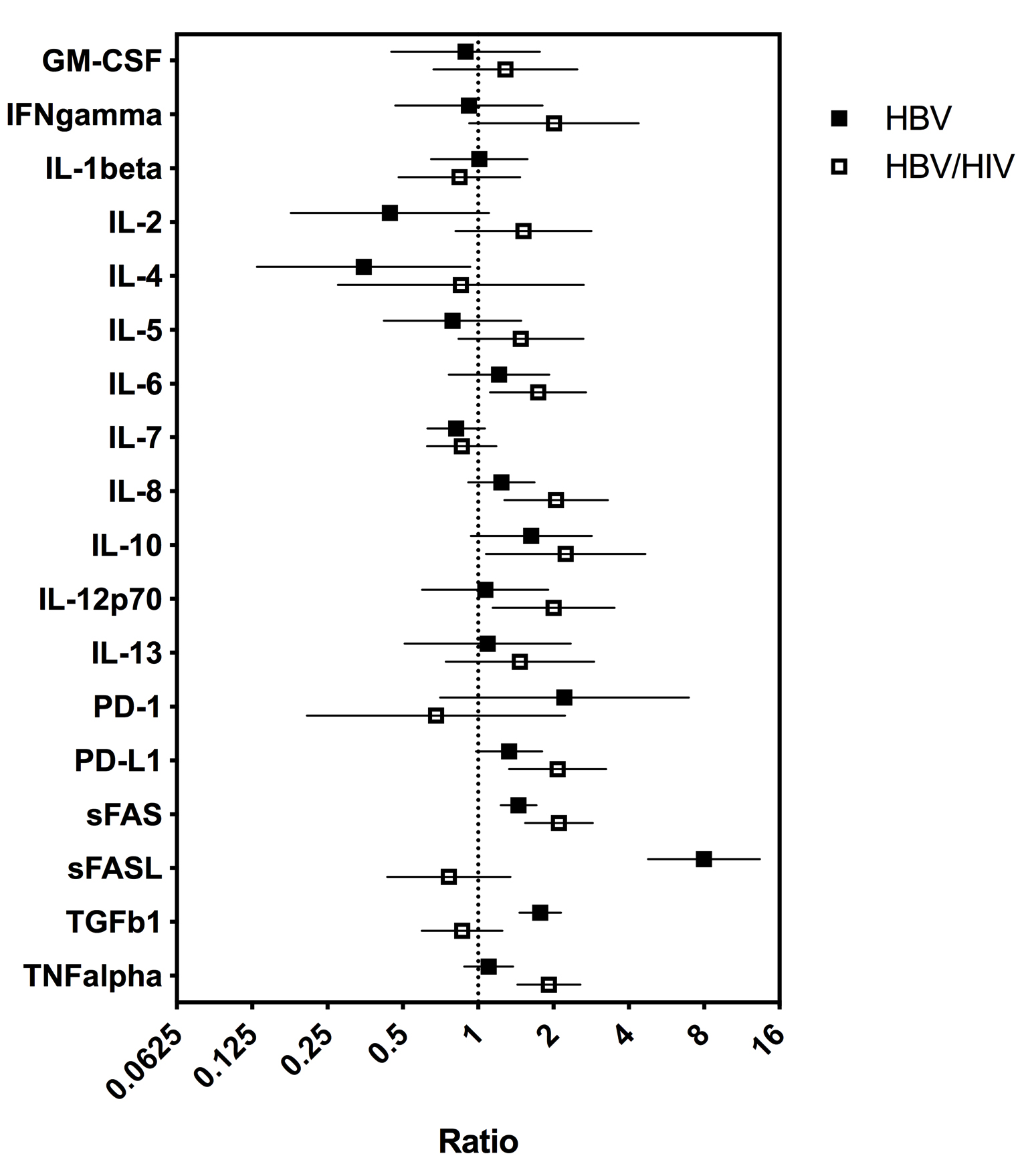 Methods: Levels of soluble Fas/FasL, TGFβ1, TNF-α, and sPD-1/sPD-L1 as well as Th1 and Th2 cytokines were evaluated in the sera of HBV-monoinfected (n=30) and HBV/HIV-coinfected (n=15) patients and compared to levels in healthy controls (n=20).