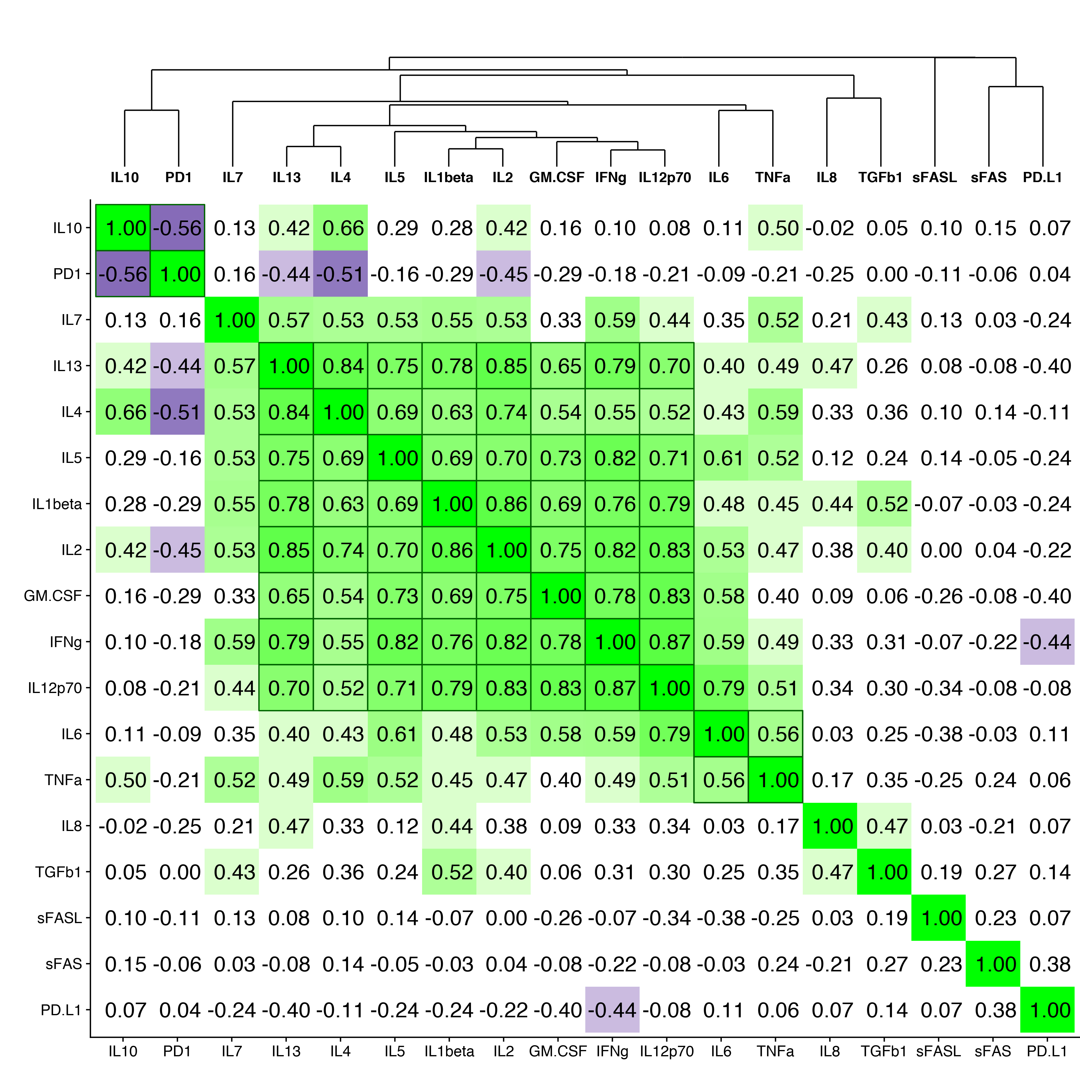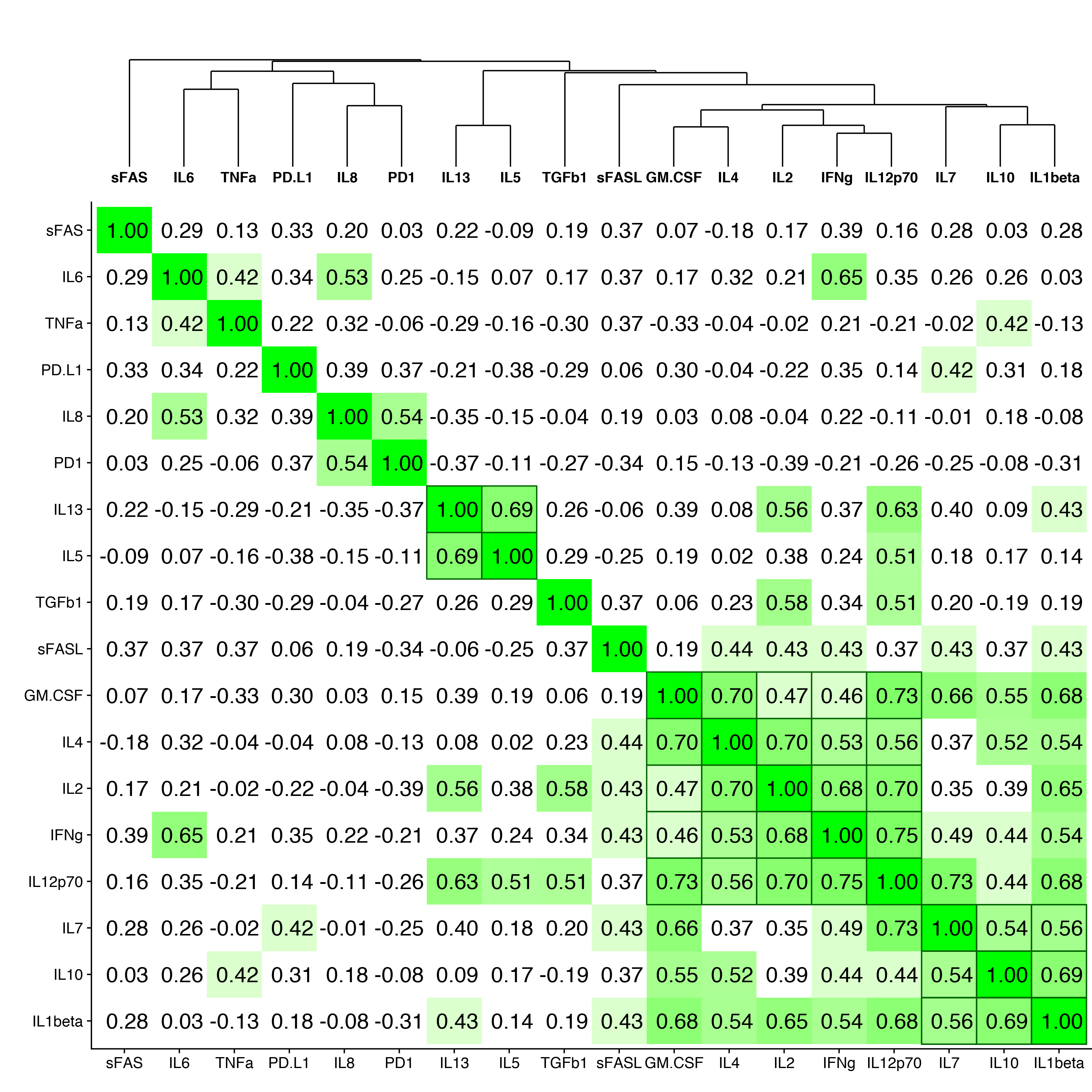 A general linear regression model was used to compare cytokine levels of individuals with disease to healthy controls adjusted for age, sex, and race effects. For each cytokine, to assess the difference between disease groups, the age, sex, and race were included in the model as covariates to evaluate potential effects on cytokine levels due to these covariates. If any of the covariates displayed statistical significance (P value < 0.05), the covariate would be included in the final general linear regression model, in addition to disease groups, to adjust for the effect due to covariates. The Spearman correlation coefficient was used to assess correlation between paired cytokine levels. The cluster analysis was applied to the correlation coefficient matrix to identify clusters of cytokines with average correlation coefficient values ³ 0.55. Statistical software packages including SAS 9.4 and R 3.4.3 were used for analysis.