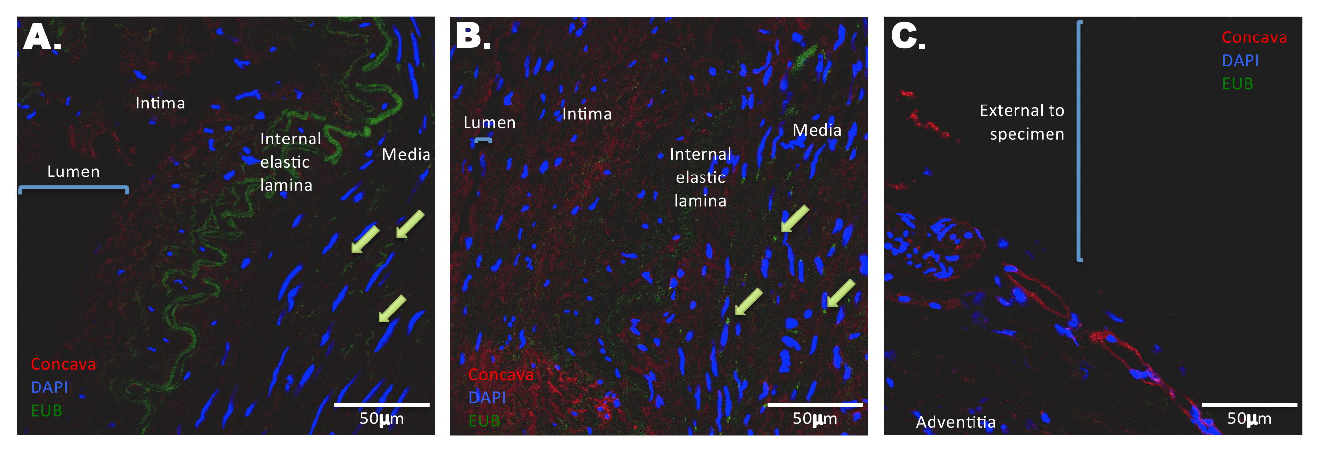 Fluorescence intensities from signals of FISH-positive bacteria were measured using Image J (NIH). The mean intensity was calculated by subtracting the background intensity for the green channel from the measured intensity within the region of interest (within the media, ie, not external to the adventitia).