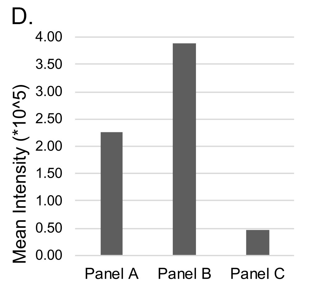 Sterile, fresh frozen temporal artery biopsies from a control patient (TA6C) and a patient with GCA (TA13G) were fixed and paraffin-embedded. FISH using an oligonucleotide probe specific for bacterial 16S rRNA revealed the presence of multiple single bacteria in the media of both control and GCA-involved arteries (Figure 1). No FISH signal corresponding to the presence of bacteria was apparent in the intimal layer, arterial lumen, or external border of the specimen. Corroborating the FISH microscopy, the mean intensity for the FISH-positive bacteria (Figure 1, bar graph) was higher in GCA-involved arteries compared to that of the control temporal artery (Figure 1B vs 1A), and no signal was ascertained at the external edge of a GCA-involved temporal artery (Figure 1C)