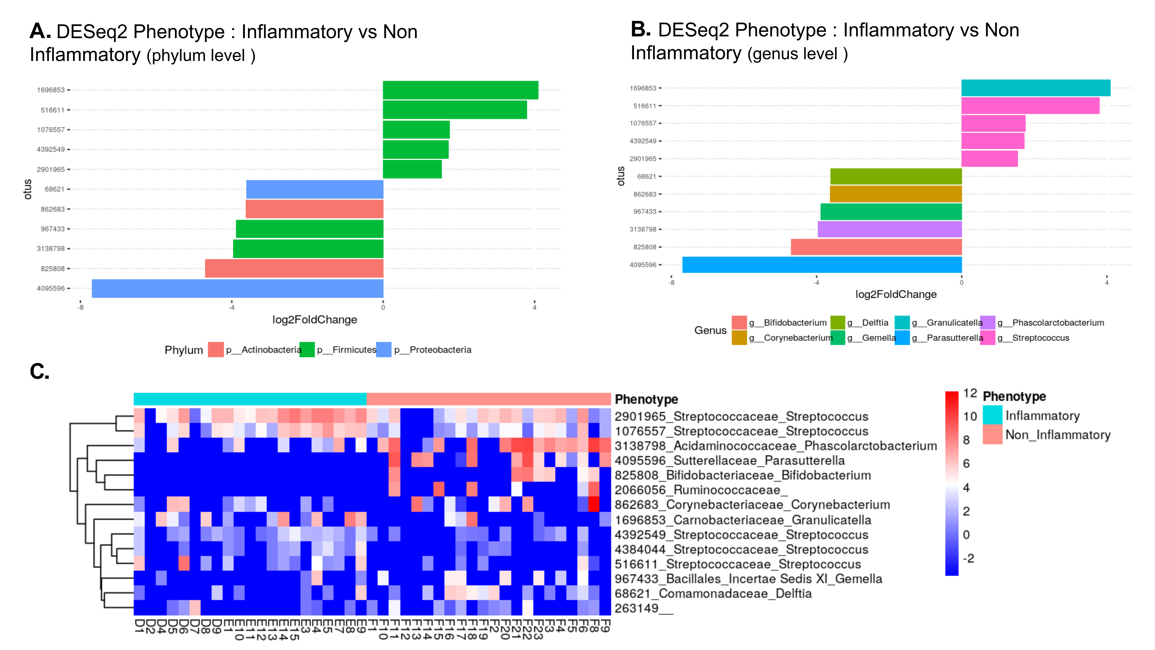 Figure 3. Most differentially abundant taxa in temporal artery biopsies from patients with GCA and from control patients. (A) Bar blot representation from DESeq2 showing the most over-represented (+) and under-represented (-) phyla in TAs from patients with GCA compared to TAs from controls. (B) Bar blot representation from DESeq2 showing the most over-represented (+) and under-represented (-) genera in TAs from patients with GCA compared to TAs from controls. (C) Heat map of bacterial communities in TA with GCA (“inflammatory” blue bar) compared to those without GCA (“noninflammatory” pink bar) based on the top dominant OTUs. Columns and rows represent samples and dominant OTUs, respectively. Row names on the right of the heat map include Green Genes ID followed by family and genus.