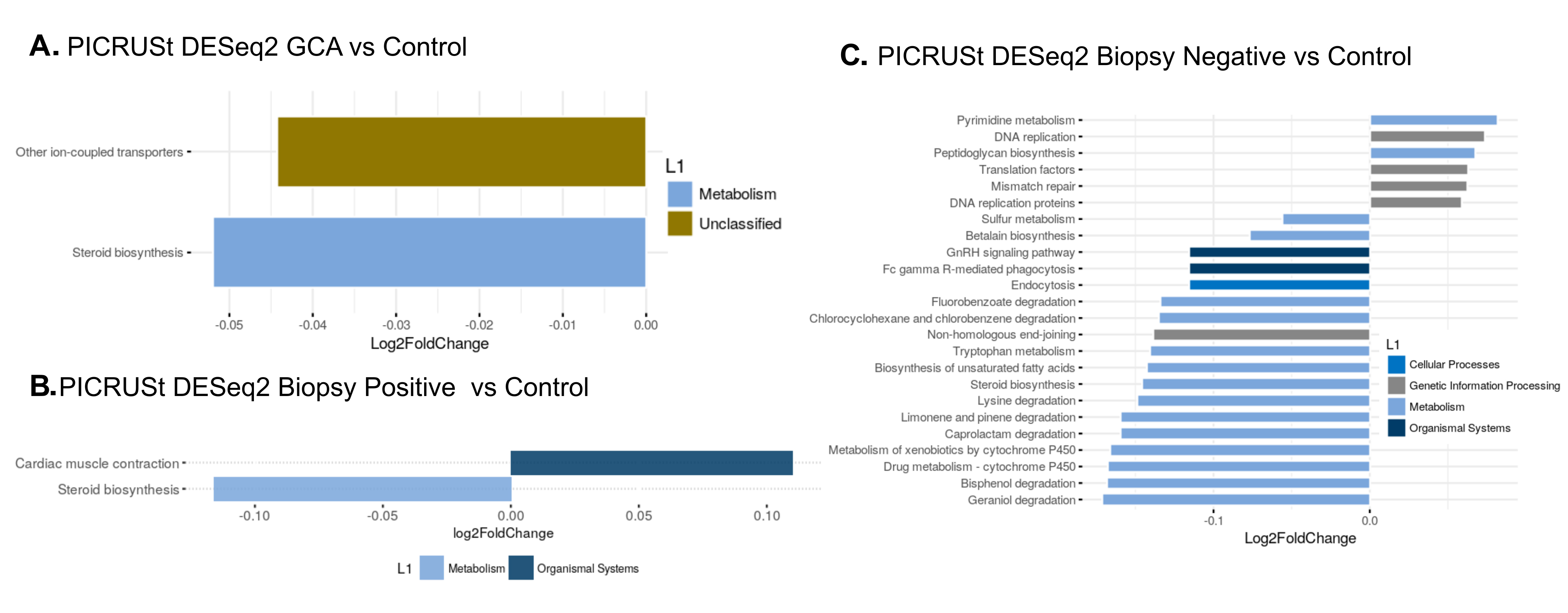 Figure 4. Predicted functional pathways differentially represented in GCA TA compared to control (non-GCA) TA. Representation of PICRUSt DESeq2 analysis yielding relatively under-represented functional pathways in (A) GCA TA compared to control TA, (B) biopsy-positive GCA TA compared to control TA and (C) biopsy-negative GCA TA versus control TA.