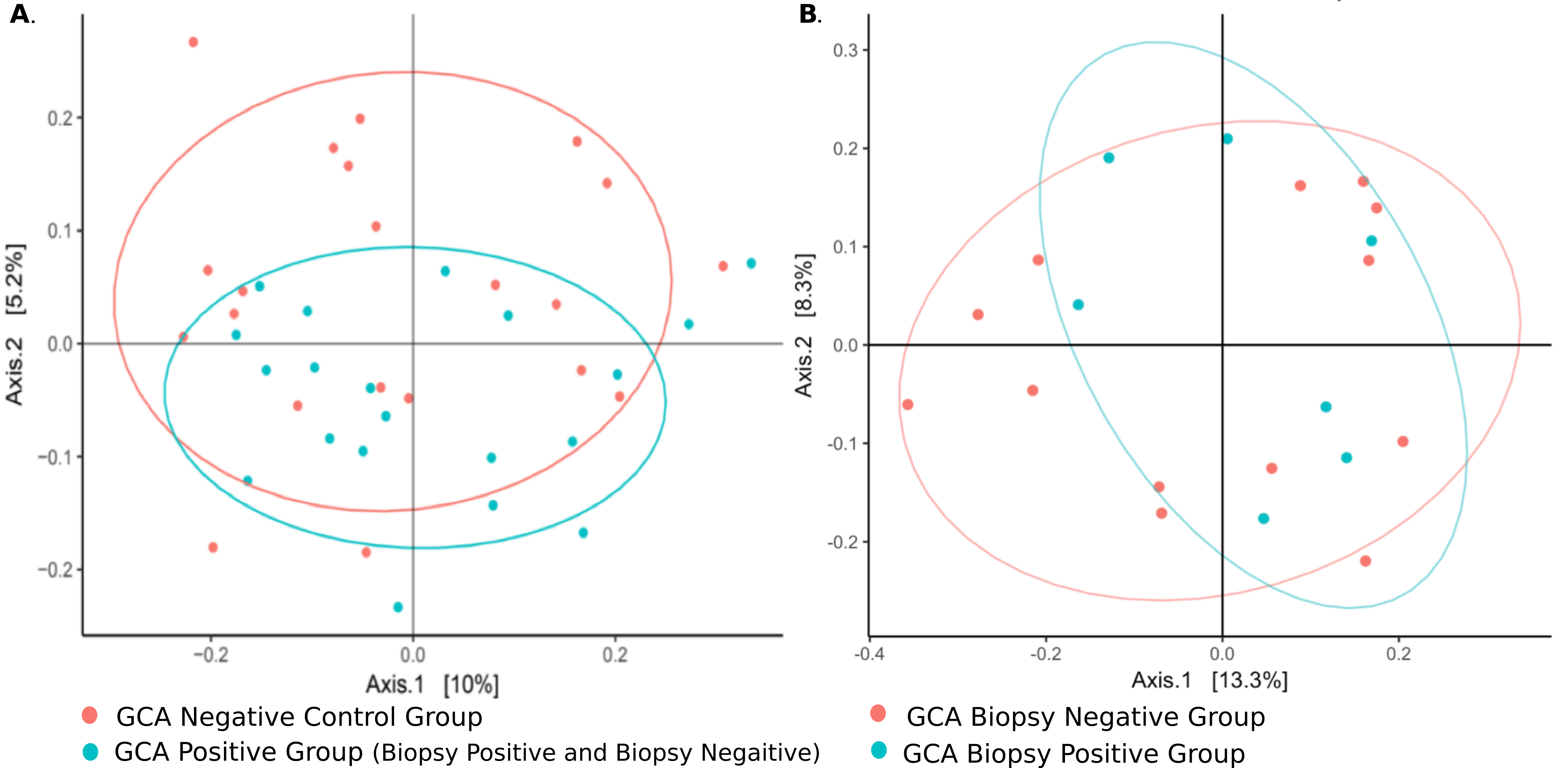 Figure 2. Microbiomes from TAs with biopsy-positive and biopsy-negative GCA cluster together but differently from those from control patients. Principal component analysis (PCoA) of TA microbiomes. (A) β-diversity (not α, data not shown), differs between GCA and control groups (P = 0.042). (B) There were no statistically significant differences between TA microbiomes in those with biopsy-positive GCA vs those with biopsy-negative/clinically positive GCA (P > 0.99).