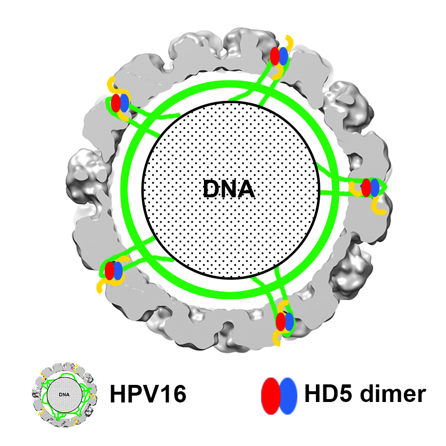 Background: Human papillomavirus (HPV) is linked to nearly all cases of cervical cancer. Despite available vaccines, a deeper understanding of the immune response to HPV is needed. Human α-defensin 5 (HD5), an innate immune effector peptide, blocks infection of multiple serotypes of HPV, including high-risk HPV16. While a common mechanism of α-defensin anti-viral activity against nonenveloped viruses such as HPV has emerged, there is limited understanding of how α-defensins bind to viral capsids to block infection.