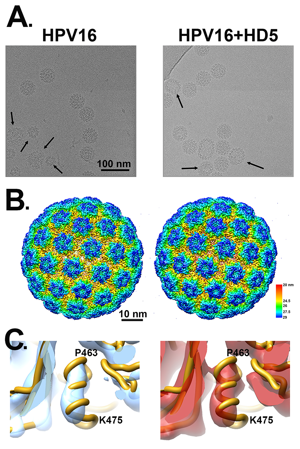 Figure 1. CryoEM of HPV16 and HPV16+HD5. (A) Representative cryo-electron micrographs of HPV16 (left) and HPV16+HD5 (right). Arrows point to capsids with heterogeneous size or shape. Scale bar = 100 nm. (B) Radially colored representations of HPV16 (left) and HPV16+HD5 (right). Scale bar = 10 nm. (C) Enlarged views of the HPV16 (left) and HPV16+HD5 (right) cryoEM maps showing α-helical density in L1 (aa 463-475, chain E) in both structures.