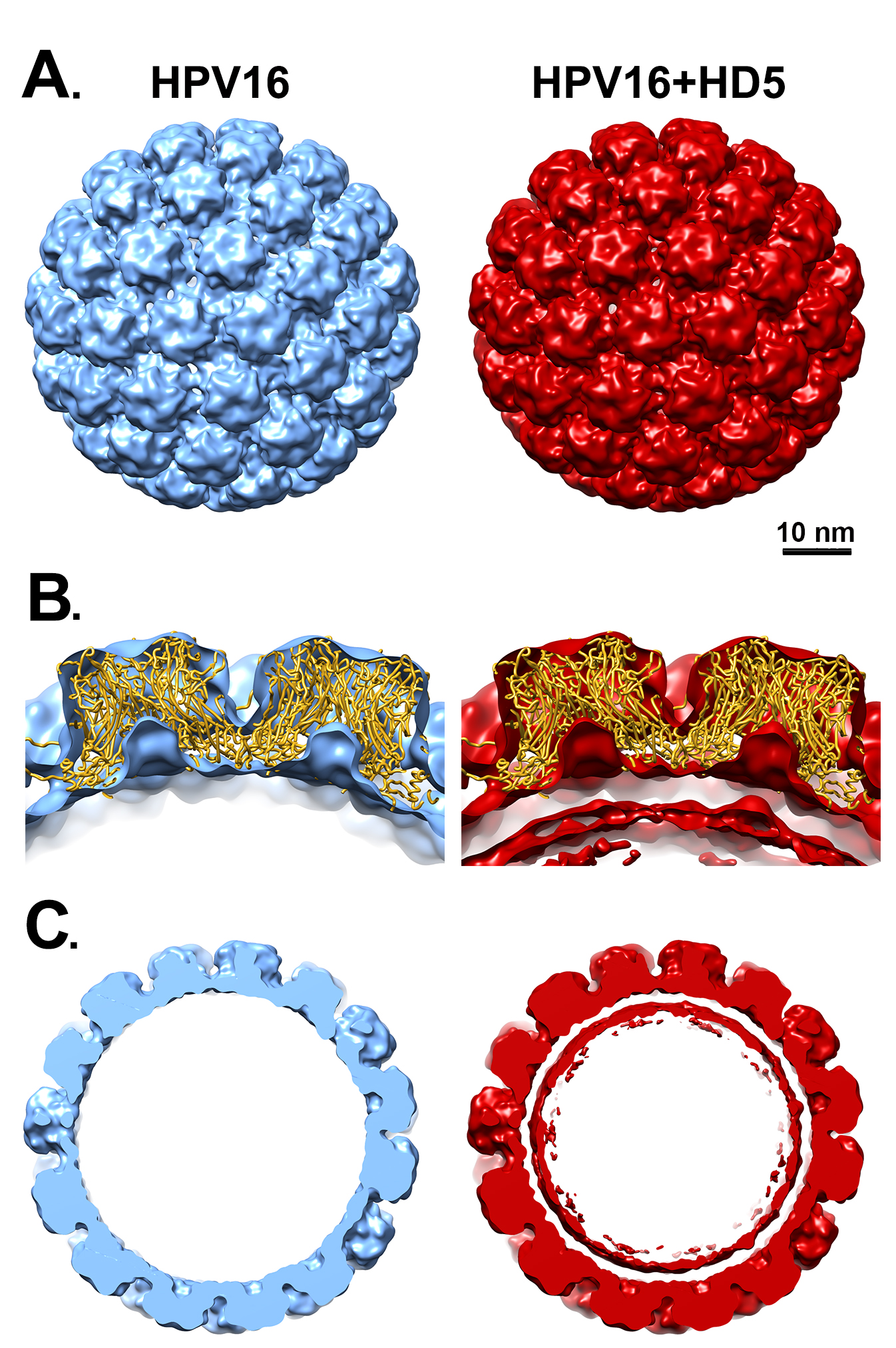 CryoEM maps for the HPV16+HD5 complex and HPV16 have been deposited in the EM database (www.emdatabank.org/) with respective accession numbers EMD: 20218 and 20219.