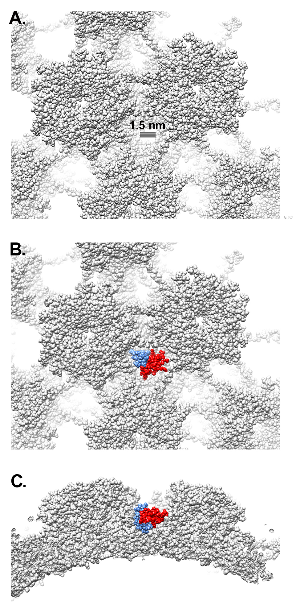 Figure 3. Gaps in the L1 capsid are smaller than HD5. (A) Space-filling representation of the L1 capsid with a scale bar indicating a capsid gap ~1.5 nm in diameter (PDB: 5KEP). (B) Space- filling representation of an HD5 dimer (red and blue) (PDB: 1ZMP, chains A and C) positioned within a depression between L1 pentamers. (C) Side view of panel B.