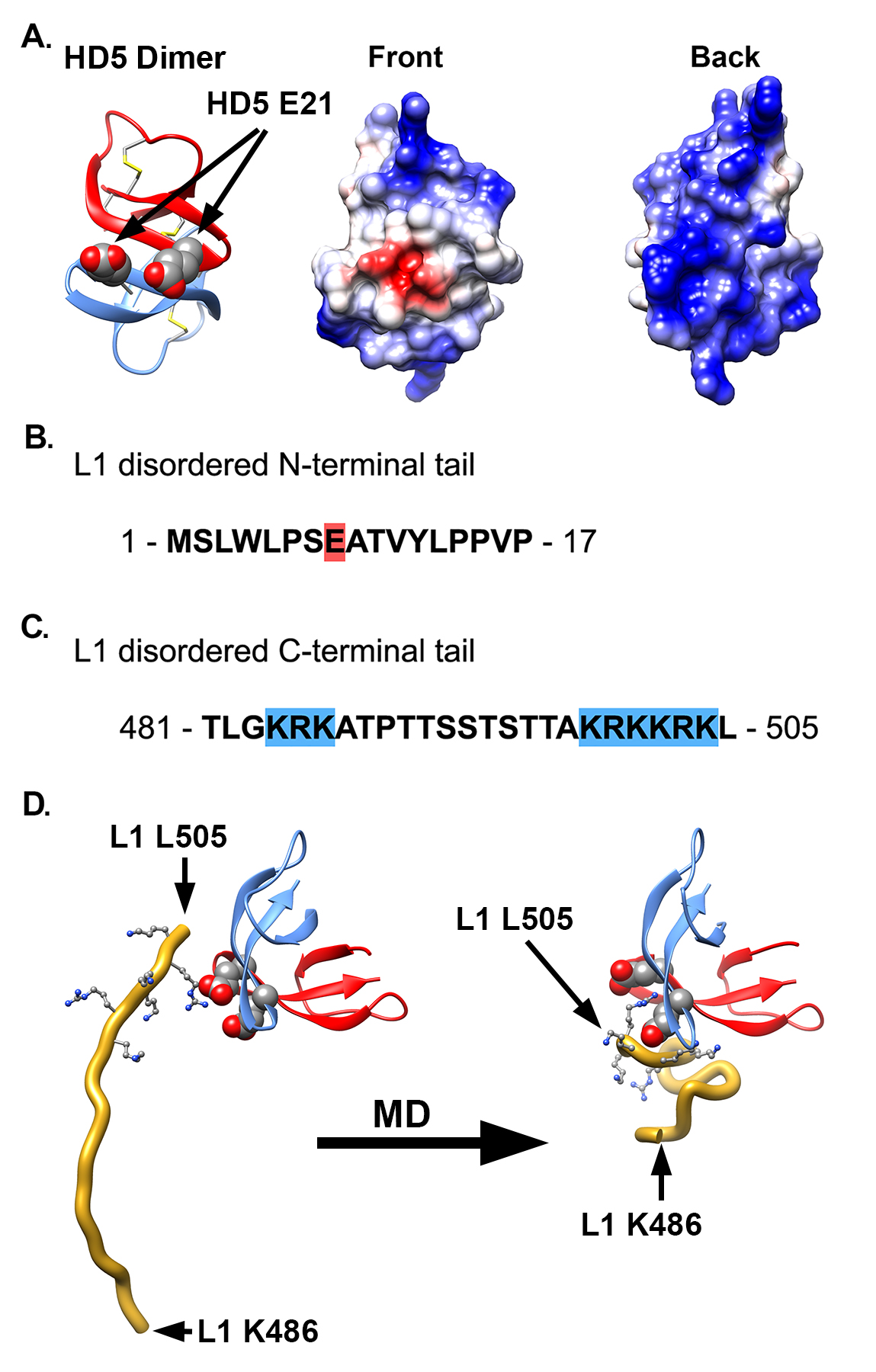 Figure 4. Proposed interaction between HD5 dimer and L1 C-terminal tail. (A) Ribbon and Coulombic surface representations of an HD5 dimer (PDB: 1ZMP, chains A and C). Disulfide bonds are depicted in stick representation and E21 residues in space-filling representation. The 2 E21 residues are next to each other in the dimer and form a negatively charged patch (red) on the Coulombic surface of a predominantly positively charged Coulombic surface. (B) Sequence of the longest disordered L1 N-terminal tail (aa 1-17) in the near-atomic resolution cryoEM-based HPV16 structure (PDB: 5KEP). (C) Sequence of the longest disordered L1 C-terminal tail (aa 481-505). In panels B and C charged residues are indicated with red (negative) or blue (positive) highlights. (D) MD-derived model of the interaction between an HD5 dimer and the L1 C-terminal tail (aa 486-505, gold ribbon). Both the starting and ending coordinates are shown. The negatively charged residues of the HD5 dimer (space-filling representation) form favorable electrostatic interactions with positively charged residues in the L1 C-terminal tail (499-KRKKRK-504, ball and stick representation).