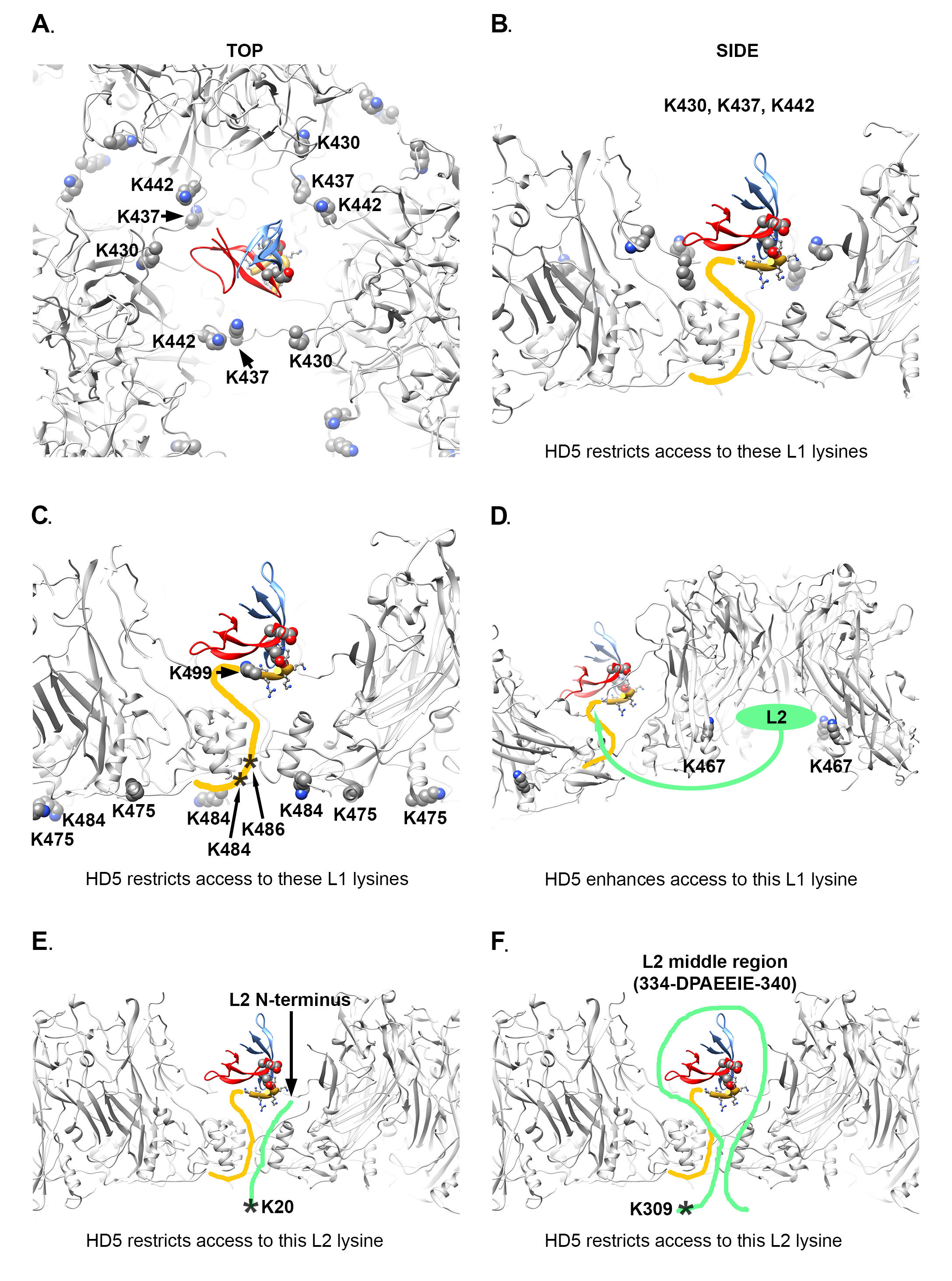 The mass spectrometry acetylation data is also consistent with the structural model derived from the CX-MS and cryoEM results and MD simulations with an HD5 dimer positioned within a depression between L1 pentamers. Figure 6A, B, and C illustrate how an HD5 dimer bound to a protruding L1 C-terminal tail would restrict access to L1 residues K430, K437, K442, K475, and K484 in the HPV16 capsid. Two additional L1 residues with reduced acetylation in the presence of HD5 (K486 and K499) are within the flexible L1 C-terminal tail.