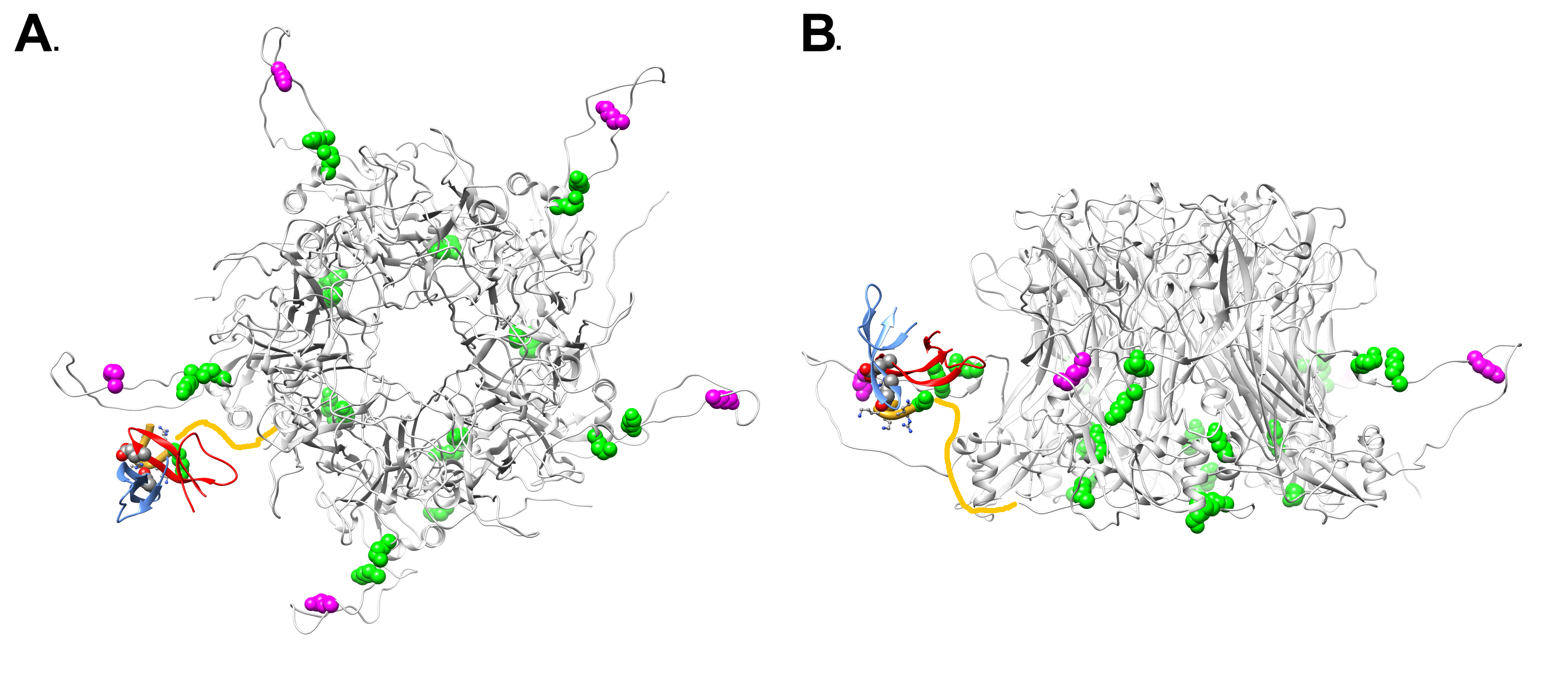 Figure 7. Overview of L1 lysine residues affected by HD5 with modeled position of HD5 dimer and L1 C-terminal tail. (A) Top view of an L1 pentamer (PDB: 5KEP, Chains B-F) with the lysine acetylation sites affected by the presence of HD5 in space-filling representation. The most affected lysine (K430) is in magenta and the other affected lysines (K437, K442, K467, K475, K484, K499) are in green. Some of the affected lysines are in the portion of the L1 C-terminal tail depicted as a yellow line (K484, K486). The MD-derived model of the HD5 dimer and the last 6 residues of the L1 C-terminal tail (aa 499-505) are in the same orientation with respect to the HPV capsid as in Figure 6. (B) Side view of panel A.