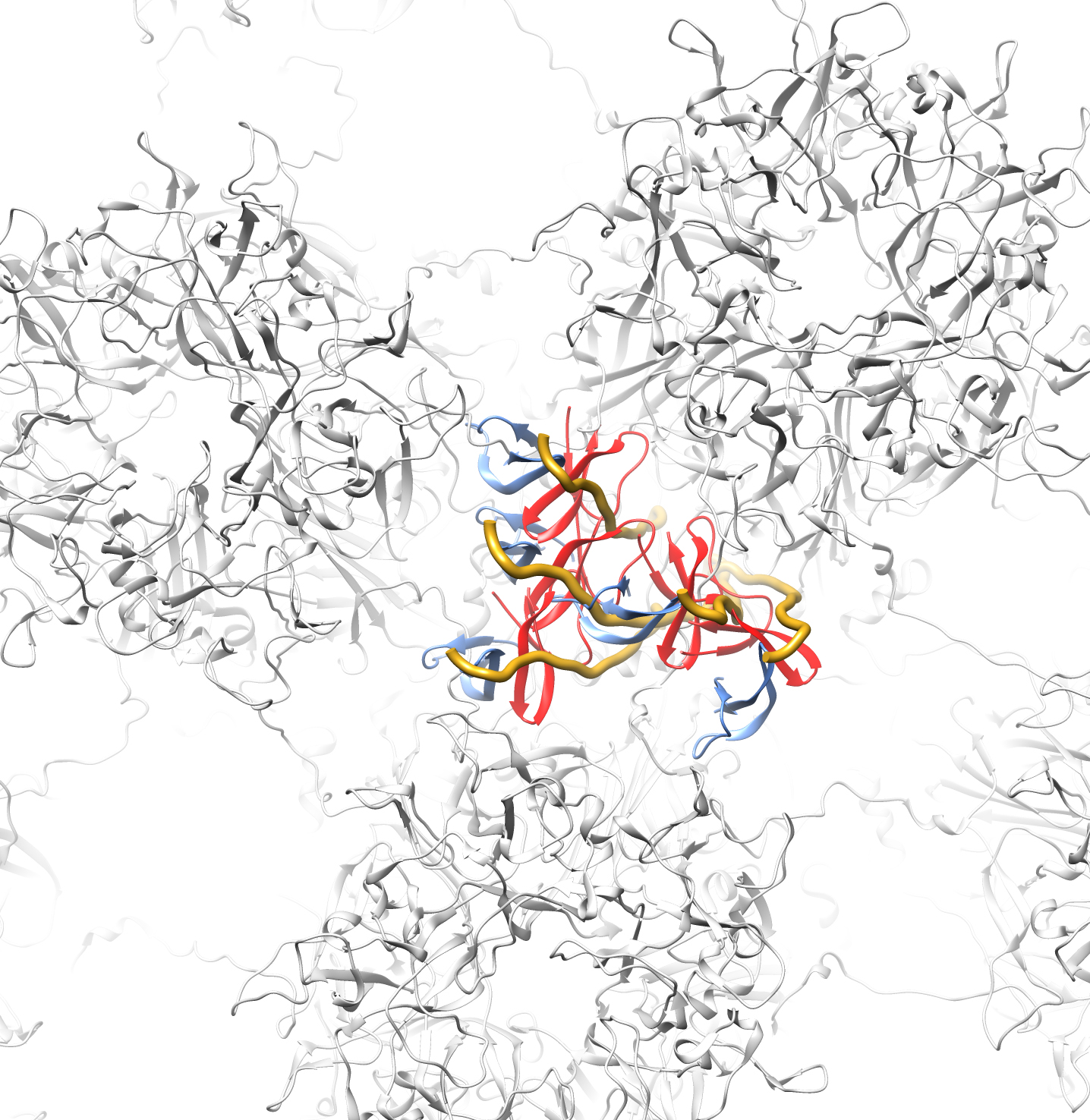 CX-MS indicates additional crosslinks between L1 (residues K484 and K486) and HD5 (Table 1). Since these 2 L1 residues (K484 and K486) are within the flexible connecting peptide between L1 F480 on the inner capsid surface and L1 K499 near the HD5 interaction site, it is difficult to measure the distance that would be spanned by a crosslinking molecule. For K484 and K486 to be within ~3 nm of HD5, the flexible L1 C-terminal tail likely bends up towards the surface of the virion, as we have modeled in Figure 5. Thus, with an HD5 dimer positioned within a depression between L1 pentamers and the L1 C-terminal tail protruding through a gap in the capsid, all of the cross-linked residues meet the spatial constraints of the experimental results.