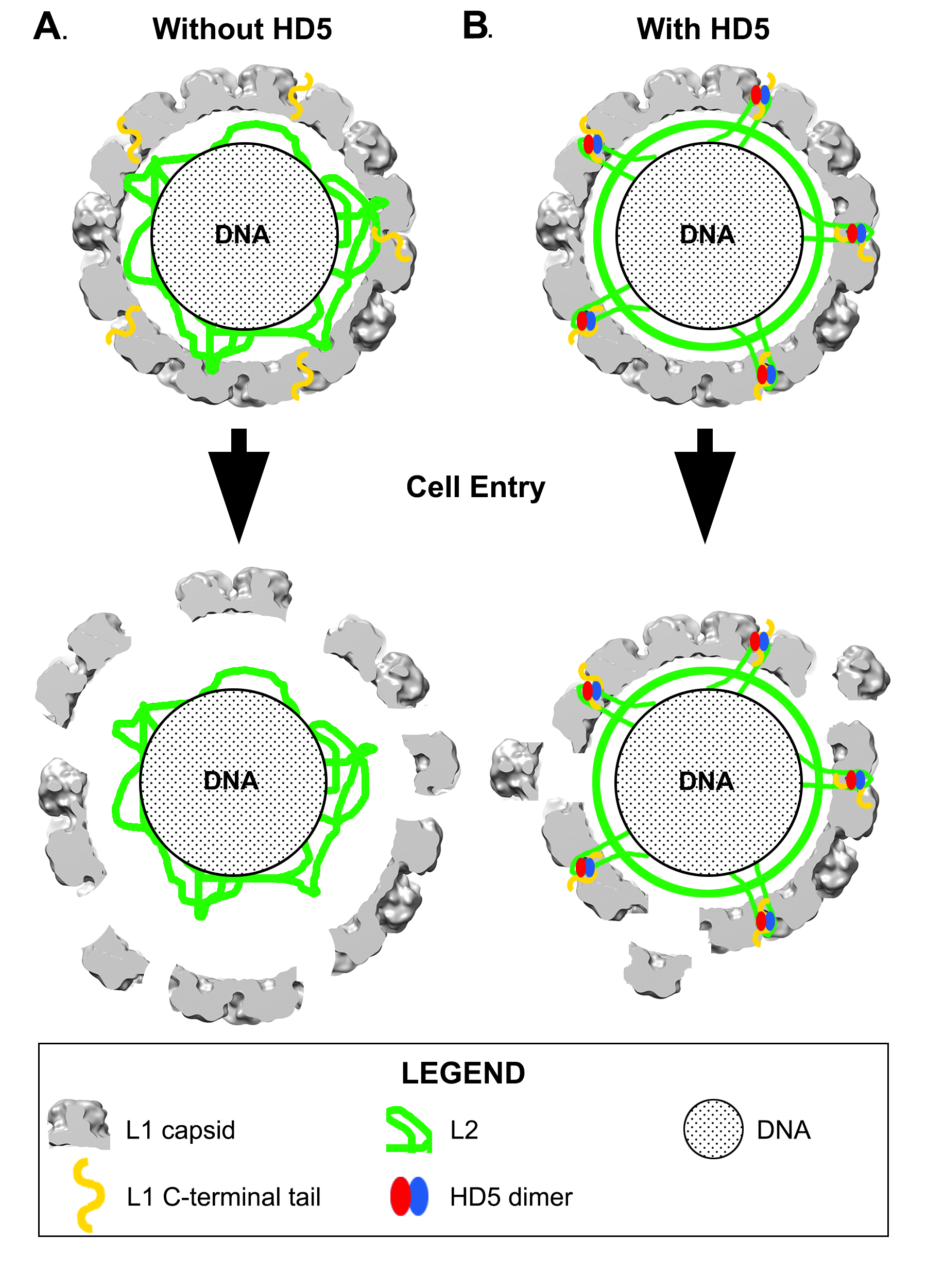 Conclusions: A model is presented for how HD5 affects HPV16 structure and cell entry. In this model, HD5 binds to disordered regions of L1 and L2 protruding from the icosahedrally ordered capsid. HD5 acts to cement interactions between L1 and L2 and leads to a closer association of the L2/genome core with the L1 capsid. This model provides a structural rationale for our prior observation that HD5 interferes with the separation of L1 from the L2/genome complex during cell entry.