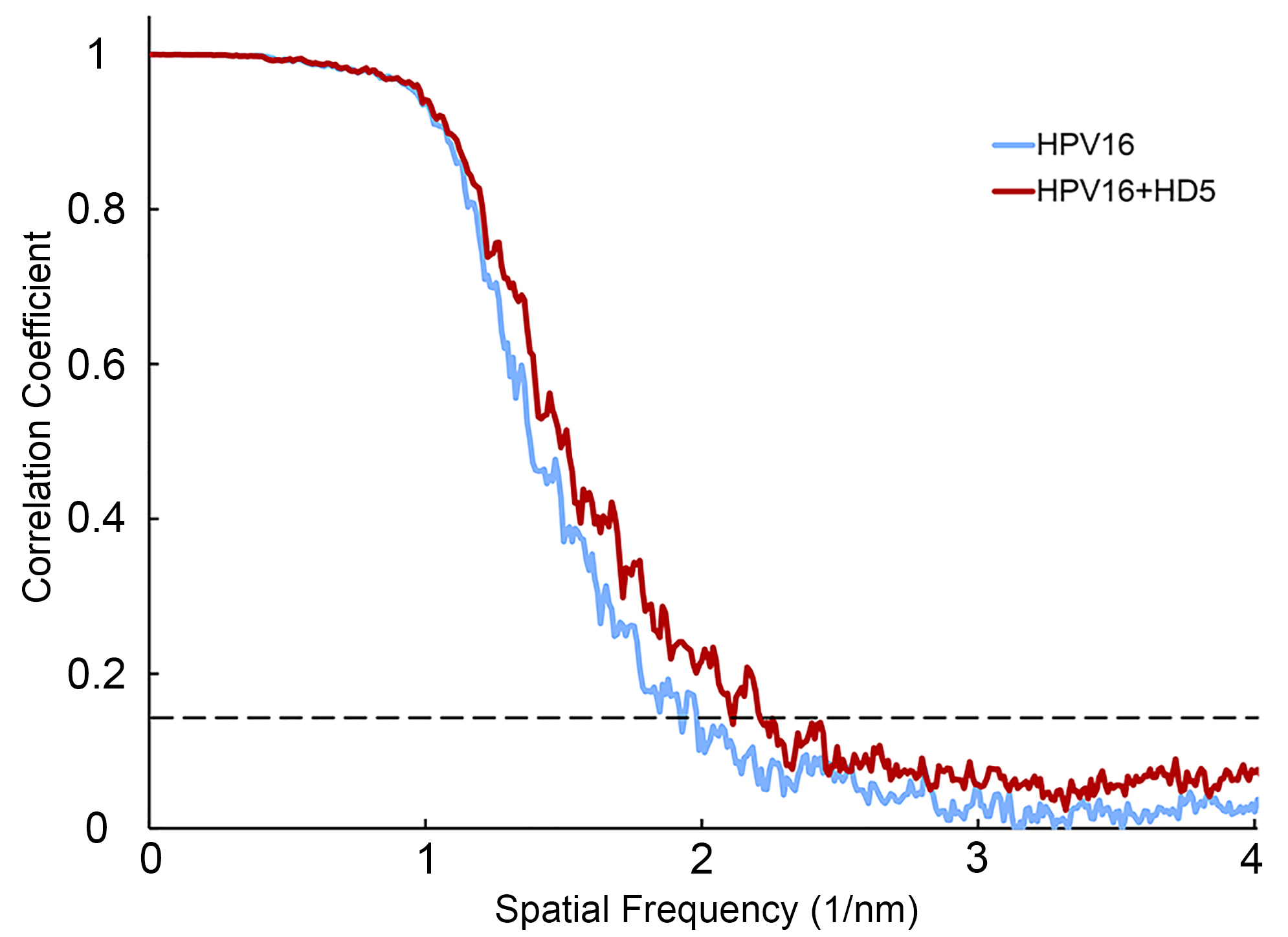 CryoEM micrographs were collected on an FEI Titan Krios 300 kV transmission electron microscope with a Direct Electron DE20 direct detector for a total electron dose of 6000 electrons/nm2. Micrographs were collected at 29,000 × magnification with a defocus range of 0.8 µm to 3.5 µm. The HPV16 PsV alone dataset included 3304 micrographs and the HPV16 PsV with HD5 dataset included 3868 micrographs. Frame alignment and radiation dose damage compensation of the micrographs was performed with the DE_process_frames software (Direct Electron).