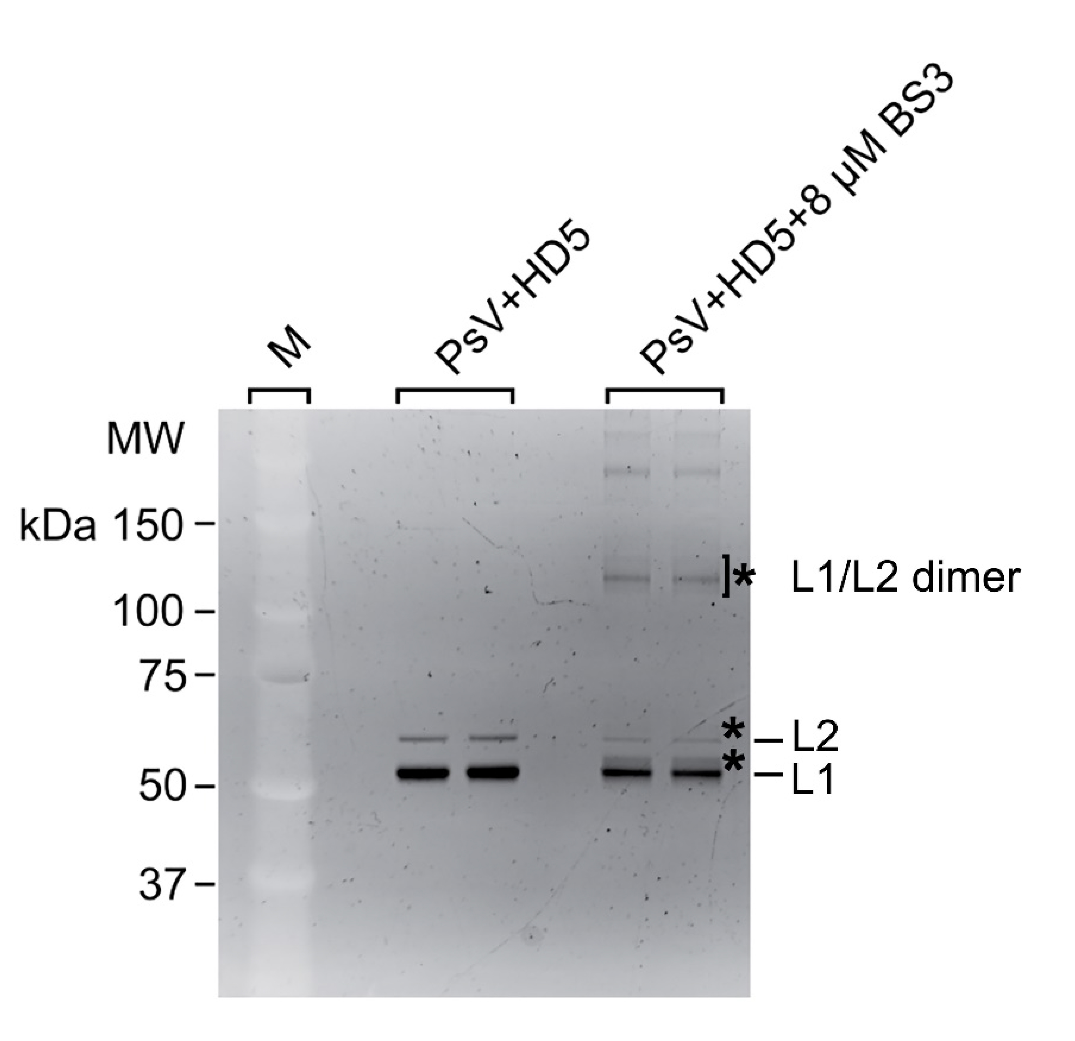 The complex of HPV16 PsV (1 µL containing 400 ng) and HD5-R13K/R32K [20] (2 µL containing 200 pmol) was mixed with 8μM bissulfosuccinimidyl suberate (BS3) and incubated at 25°C for 45 minutes in 10 µL of DPBS. The reaction was stopped by adding 1 µL of 130mM Tris buffer, pH 7.4. The reaction mixture was separated on a NuPAGE 4%–12% Bis–Tris gel using MES running buffer, and the crosslinked protein complexes were visualized by SYPRO Ruby. Three regions of the SDS-PAGE gel corresponding to crosslinked complexes for L1-HD5, L2-HD5, and the L1-L2 dimer (Figure S2) were excised, the proteins were in-gel digested using trypsin [50], and the digests were analyzed by LC-MS/MS as described below. Possible crosslinked peptides were identified using MassMatrix database search software (Version 3.10, MassMatrix, Columbus, OH), and all the possible crosslinked peptides were manually verified by inspecting their MS/MS spectra.