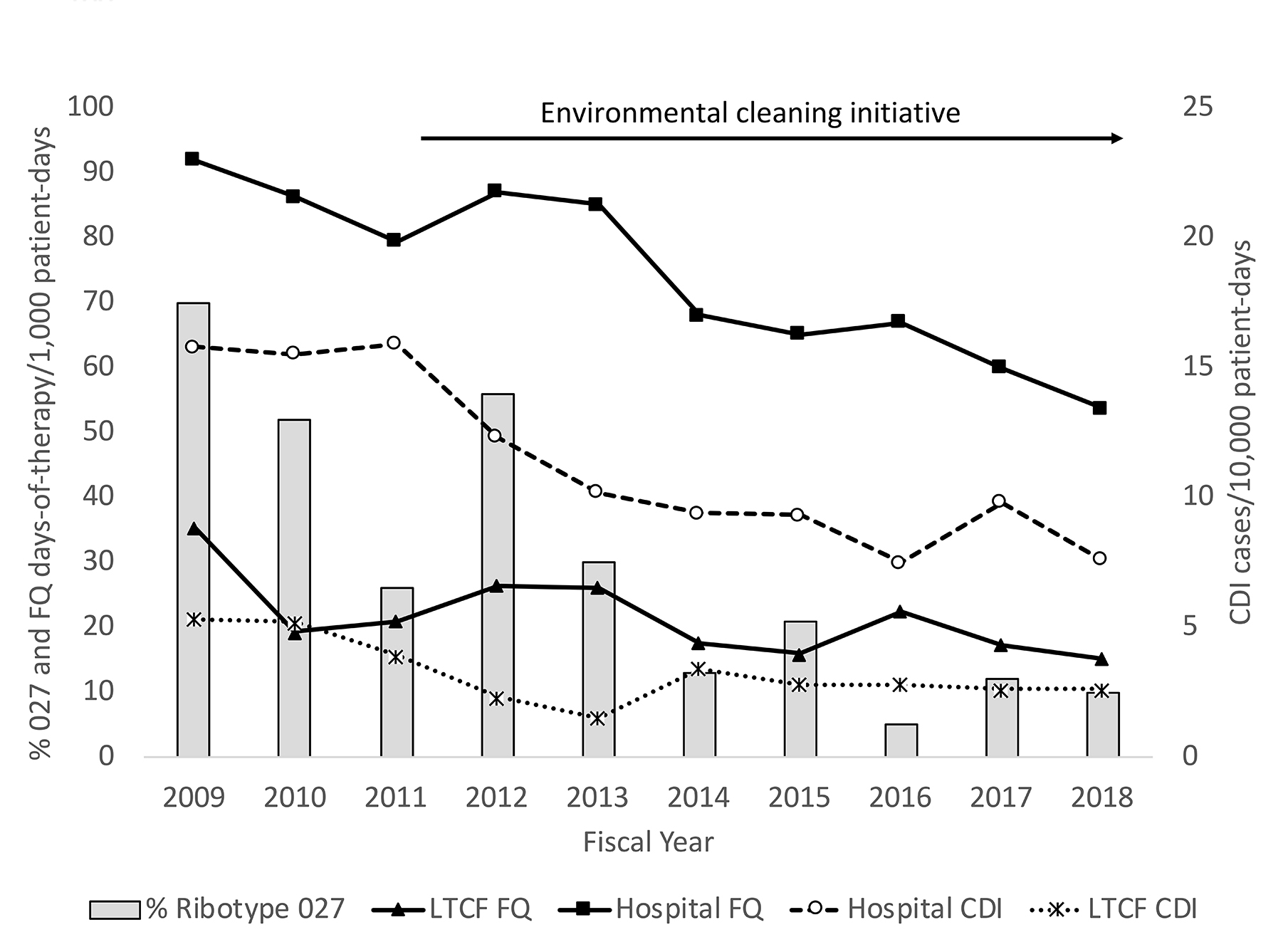 Figure 1. Changes in the incidence of hospital- and long-term care facility (LTCF)-associated Clostridioides difficile infection (CDI) and in the percentage of CDI infections due to ribotype 027 strains during a period of decreasing fluoroquinolone use. The environmental cleaning initiative resulted in reduced environmental contamination with C. difficile. Stewardship interventions also resulted in reductions in hospital use of penicillins, carbapenems, and intravenous vancomycin during the study period. Note. FQ, fluoroquinolone.