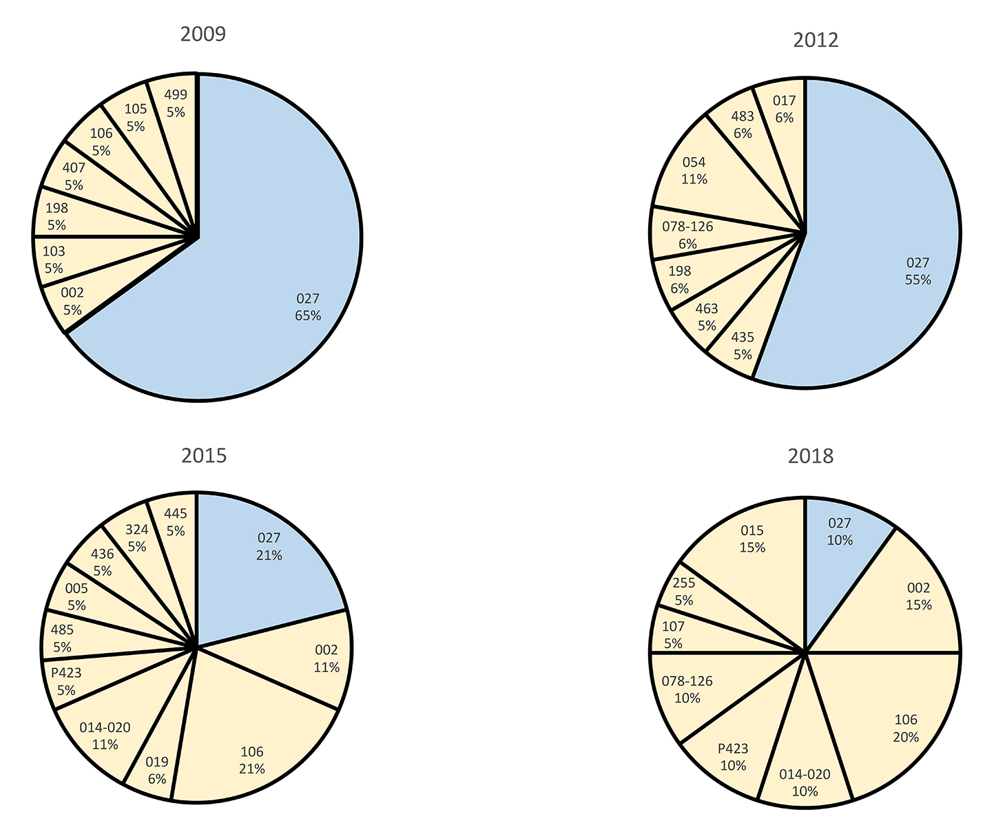 Figure 2. Distribution of polymerase chain reaction ribotypes of Clostridioides difficile isolates recovered from stool specimens testing positive for C. difficile during 4 representative years in a 10-year period. There were a total of 203 isolates (20 to 23 per year) subjected to ribotyping.