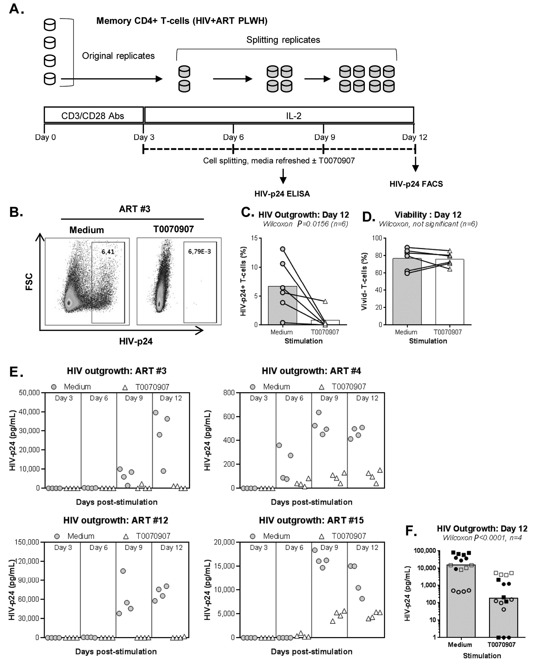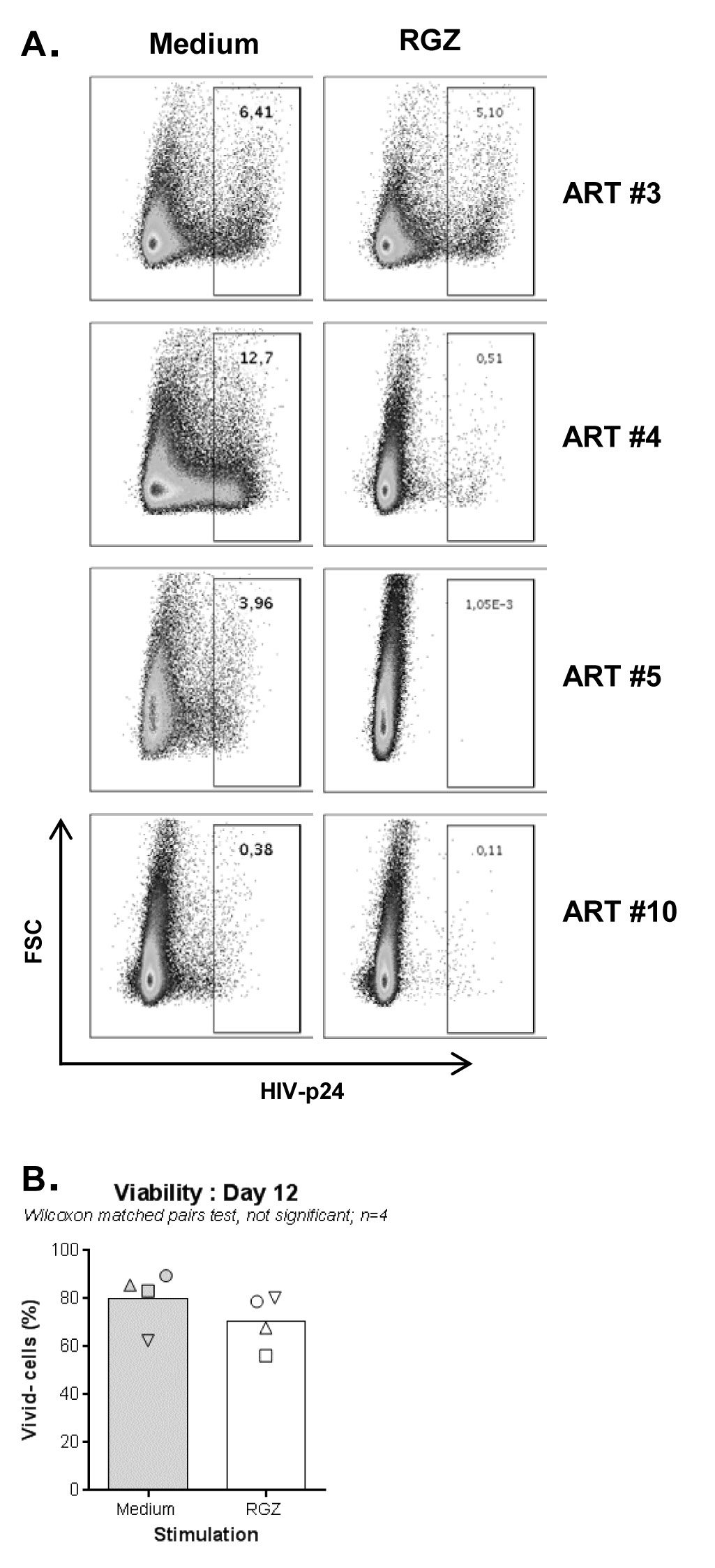Supplementary Figure 3. RGZ limits HIV outgrowth in memory CD4+ T cells of ART-treated PLWH. A VOA was performed with memory CD4+ T cells of ART treated PLWH (Table 1; ART #3, 4, 5, and 10) in the presence/absence of rosiglitazone (RGZ; 50 µM). At day 12 post-culture, cells were stained as in Figure 2B. Shown is the effect of RGZ on the intracellular expression of HIV-p24 in 4 different ART-treated PLWH (A), as well as the effect of RGZ exposure on cell viability (B). Wilcoxon matched-pairs signed rank test P-values are indicated on the graph in B.