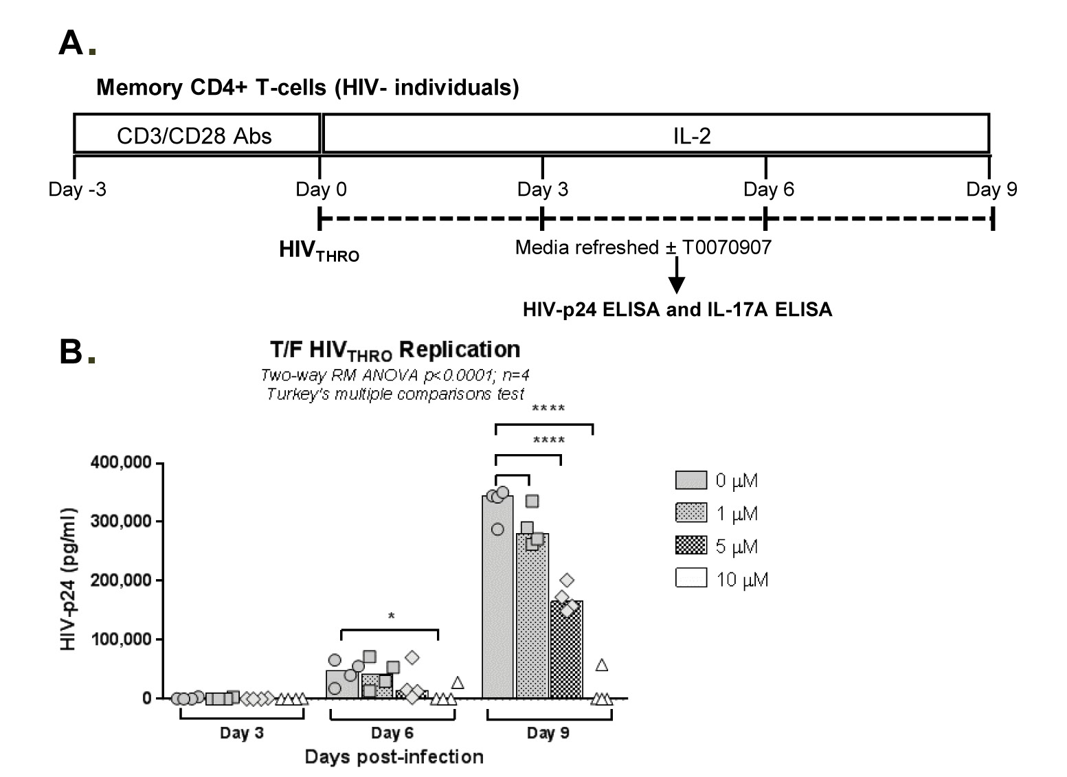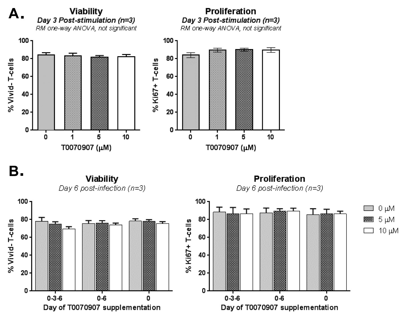 Supplementary Figure 2. Effects of T0070907 of CD4+ T-cell viability and proliferation. (A) Memory CD4+ T cells isolated from HIV-uninfected individuals were 11 stimulated by CD3/CD28 and cultured in the presence/absence of different doses of 12 T0070907 (1, 5, and 10μM) for 3 days, with T0070907 being administered only once. 13 Cells were stained with a viability dye (Vivid), and then intranuclear staining was 14 performed with Ki67 antibodies; Ki67, a marker for cell cycle progression, was used as a 15 surrogate marker of cell proliferation. Shown is cell viability (Vivid- cells, left panel) 16 and proliferation (Ki67+ cells, right panel) measured by flow cytometry with cells from 17 n=3 individuals. (B) Memory CD4+ T cells isolated from HIV-uninfected individuals 18 were stimulated by CD3/CD28, infected with HIVTHRO (as described in Figure 3 legend), 19 and cultured in the presence or the absence of T0070907 (5 and 10 μM). To determine 20 the effect of single versus multiple T0070907 doses on cell viability/proliferation, 21 T0070907 was administered either once at day 0 post-infection (0), twice at days 0 and 6 post-infection (0-6), or every 3 days post-infection (0-3-6). Shown are mean±SD of values obtained with cells from n=3 individuals.