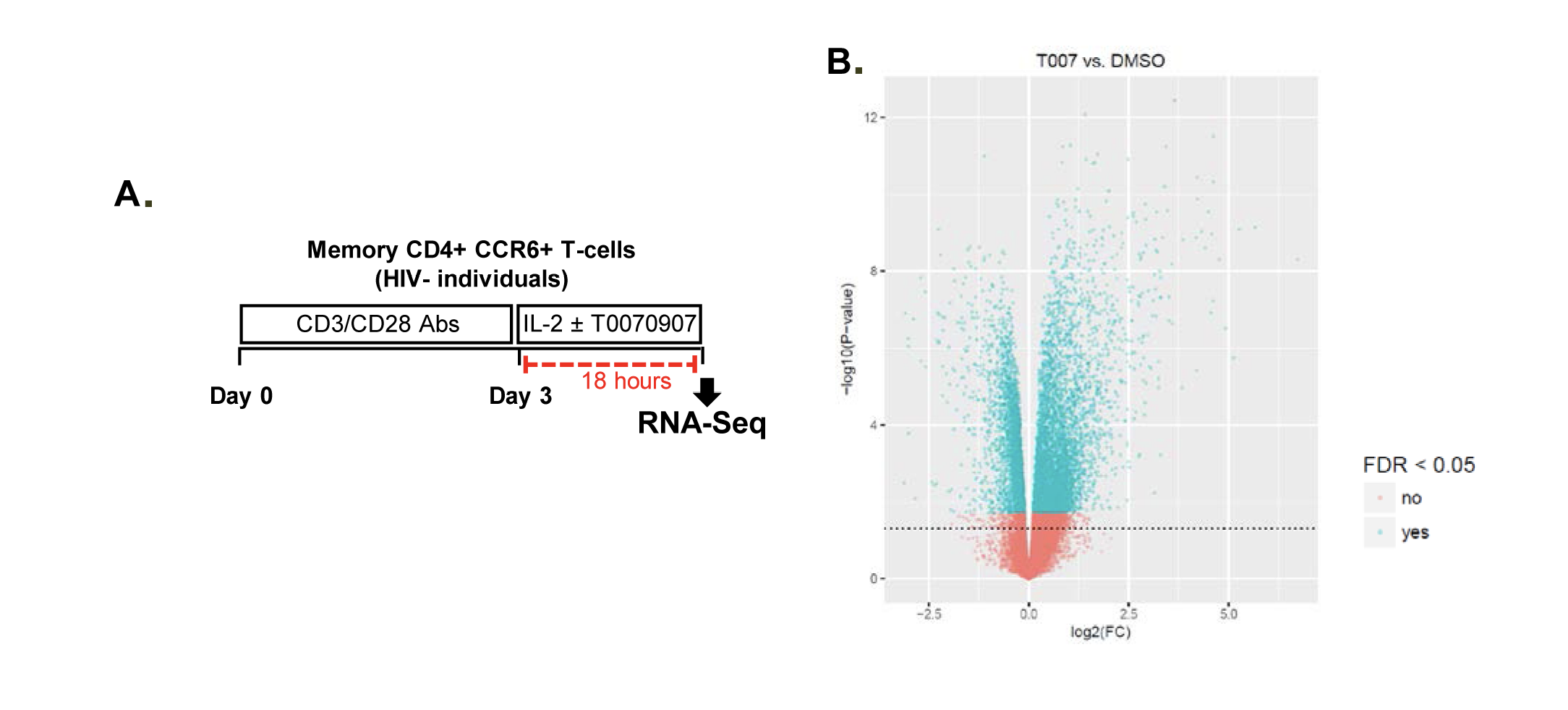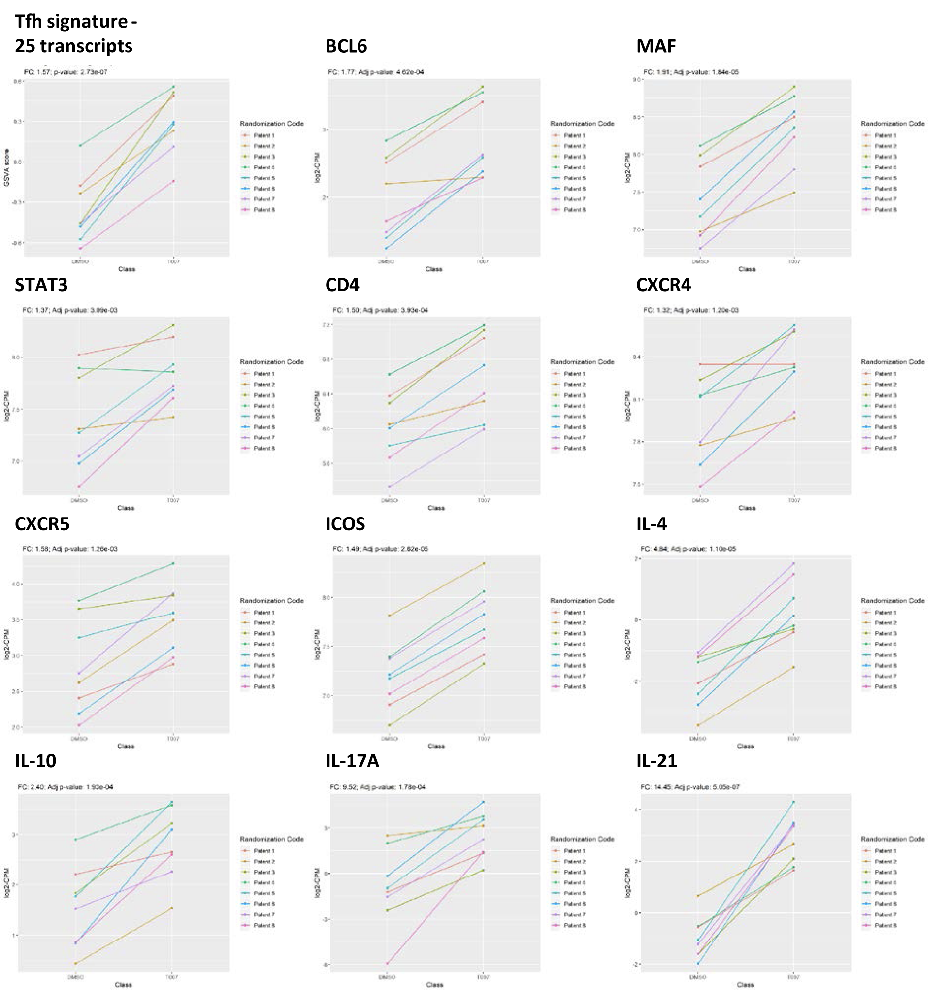 Supplementary Figure 7. T0070907 acts on CCR6+ T cells to promote expression of follicular helper T-cell (Tfh) marker transcripts. RNA-Seq transcriptional profiles were generated as described in Figure 5. An intelligent search was performed to identify Tfh-specific transcripts among transcripts upregulated by T0070907 in CCR6+ T cells. Shown are changes in the expression of 25 Tfh-specific transcripts identified in the literature (Crotty, 2019), as well as individual Tfh-specific transcription factors (BCL6, MAF, and STAT3), surface molecules (CD4, CXCR4, CXCR5, and ICOS), and cytokines (IL-4, IL-10, IL-17A, and IL-21). Results from n=8 individual donors are represented in different colors.