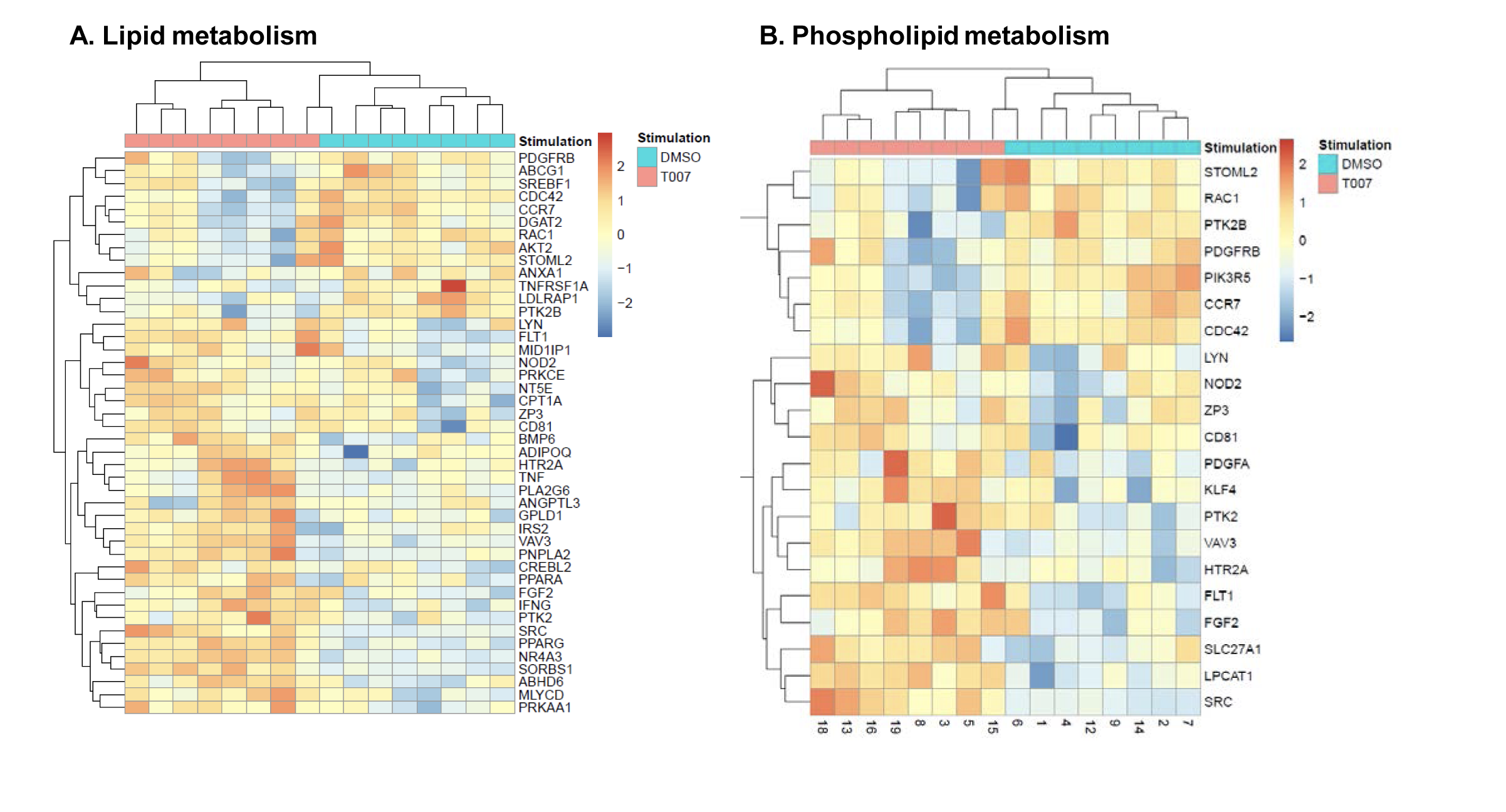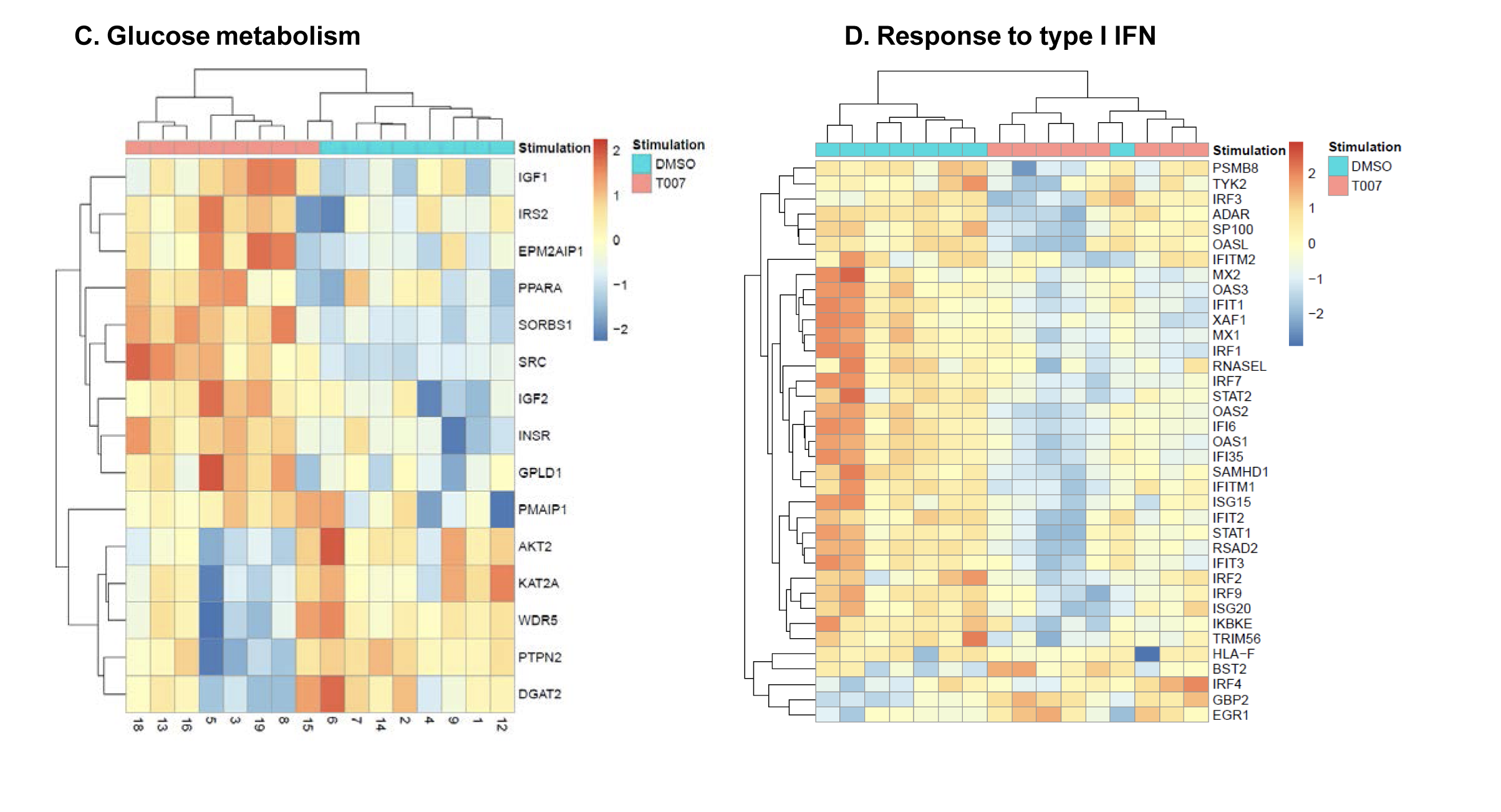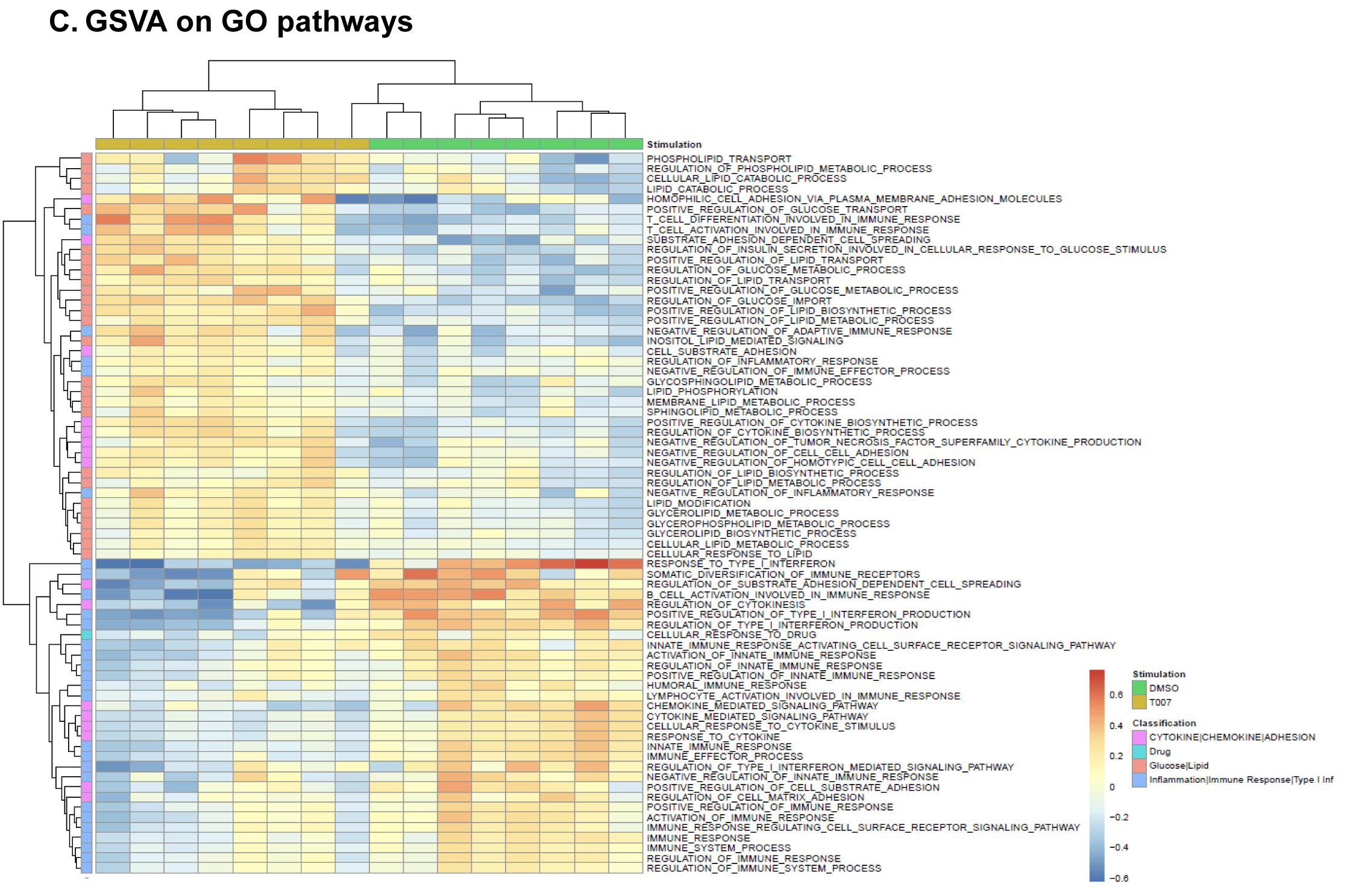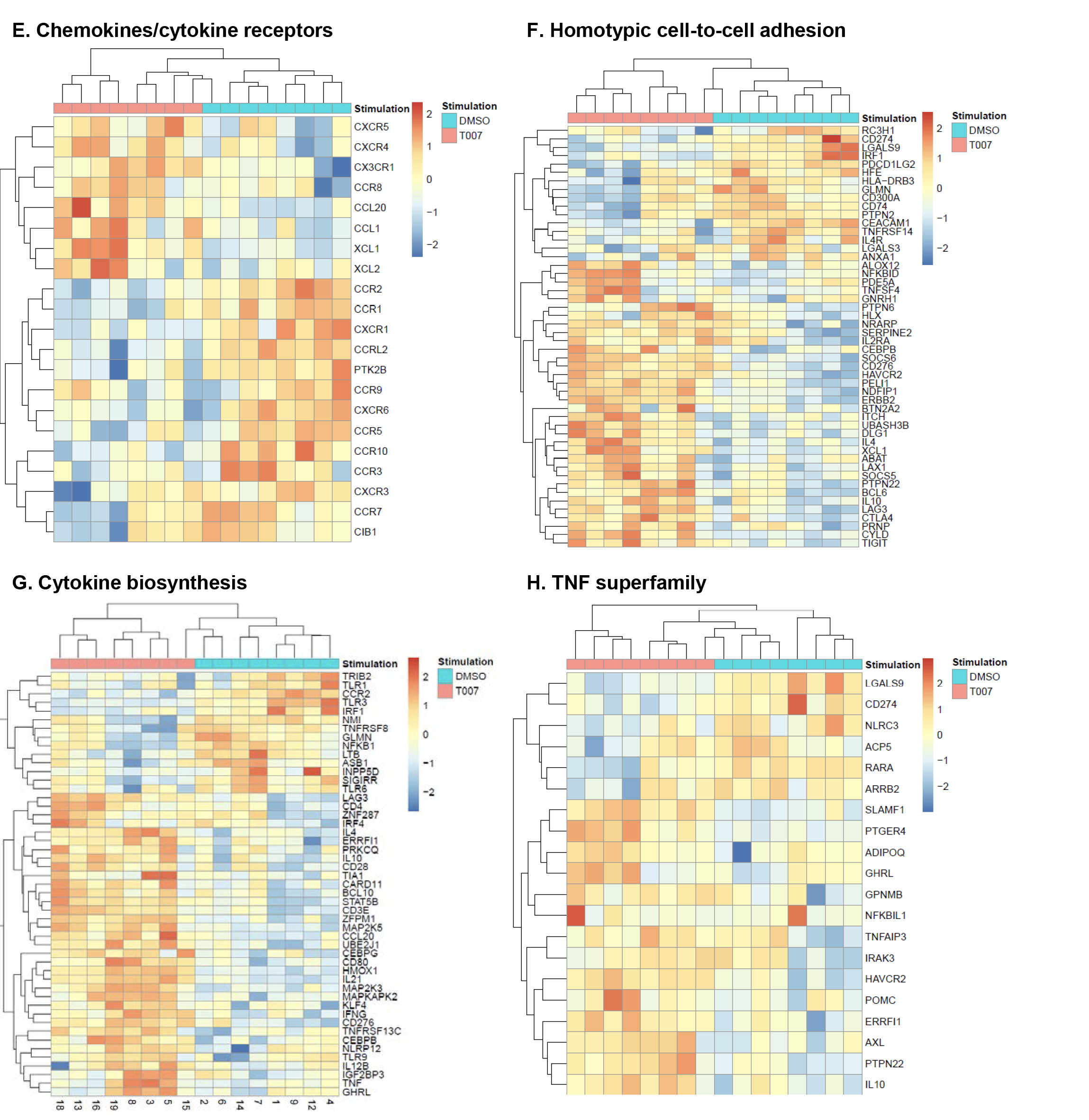 Supplementary Figure 5. Gene Ontology (GO) classification of transcripts modulated by T0070907 in CCR6+ T cells. RNA-Seq transcriptional profiles were generated as described in Figure 5. Differentially expressed genes (P<0.05) were classified based on their biological functions using GO terms as follows: lipid metabolism (A), phospholipid metabolism (B), glucose metabolism (C), response to type I IFN (D), chemokines/cytokines receptors (E), homotypic cell-to-cell adhesion (F), cytokine biosynthesis (G), and TNF superfamily (H). Heatmap cells are scaled by the expression level z-scores for each probe individually. For each heatmap, gene expression values are represented as a gradient from red (highest expression) to blue (lowest expression). Results were generated with cells from n=8 donors, with each column representing 1 donor.