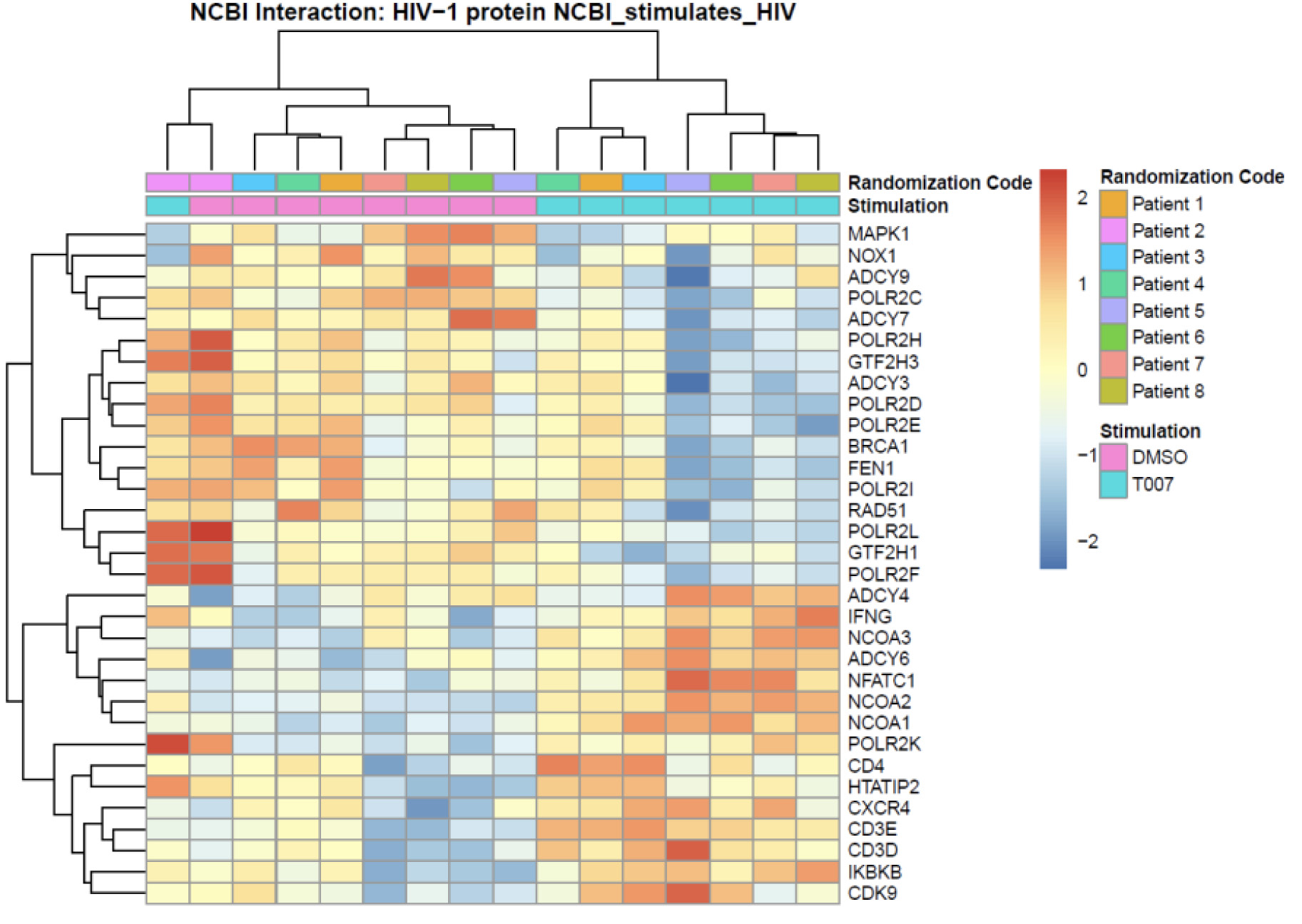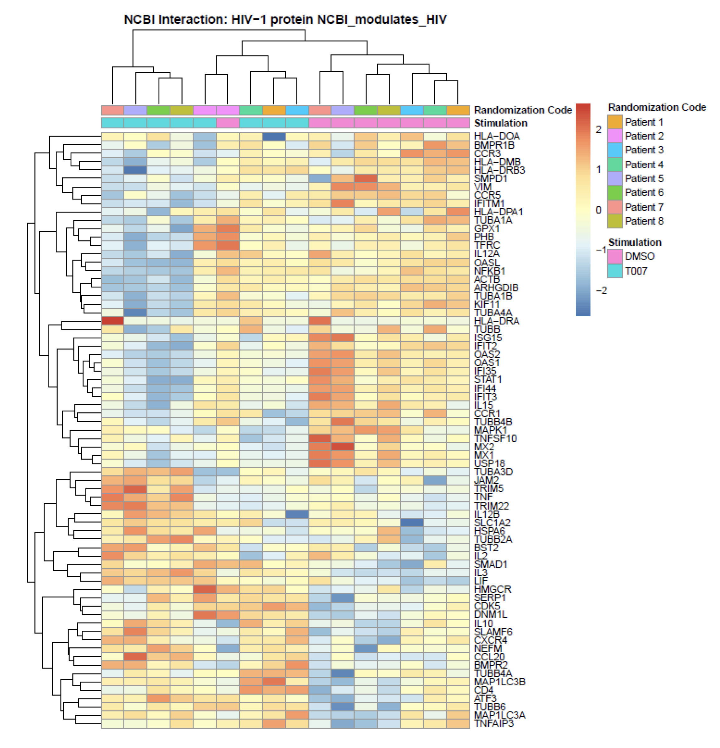 Supplementary Figure 8. Meta-analysis using the NCBI HIV interaction database. RNA-Seq transcriptional profiles were generated as described in Figure 5. Transcripts differentially expressed in CCR6+ T cells cultured in the presence/absence of T0070907 (P< 0.05, FC cut-off 1.3) were matched to the lists of human genes previously identified to interact with HIV-1 proteins (NCBI Interactor database). Heatmap cells are scaled by the expression level z-scores for each probe individually. For each heatmap, gene expression values are represented as a gradient from red (highest expression) to blue (lowest expression). Results from each donor are indicated with a different color code (n=8).