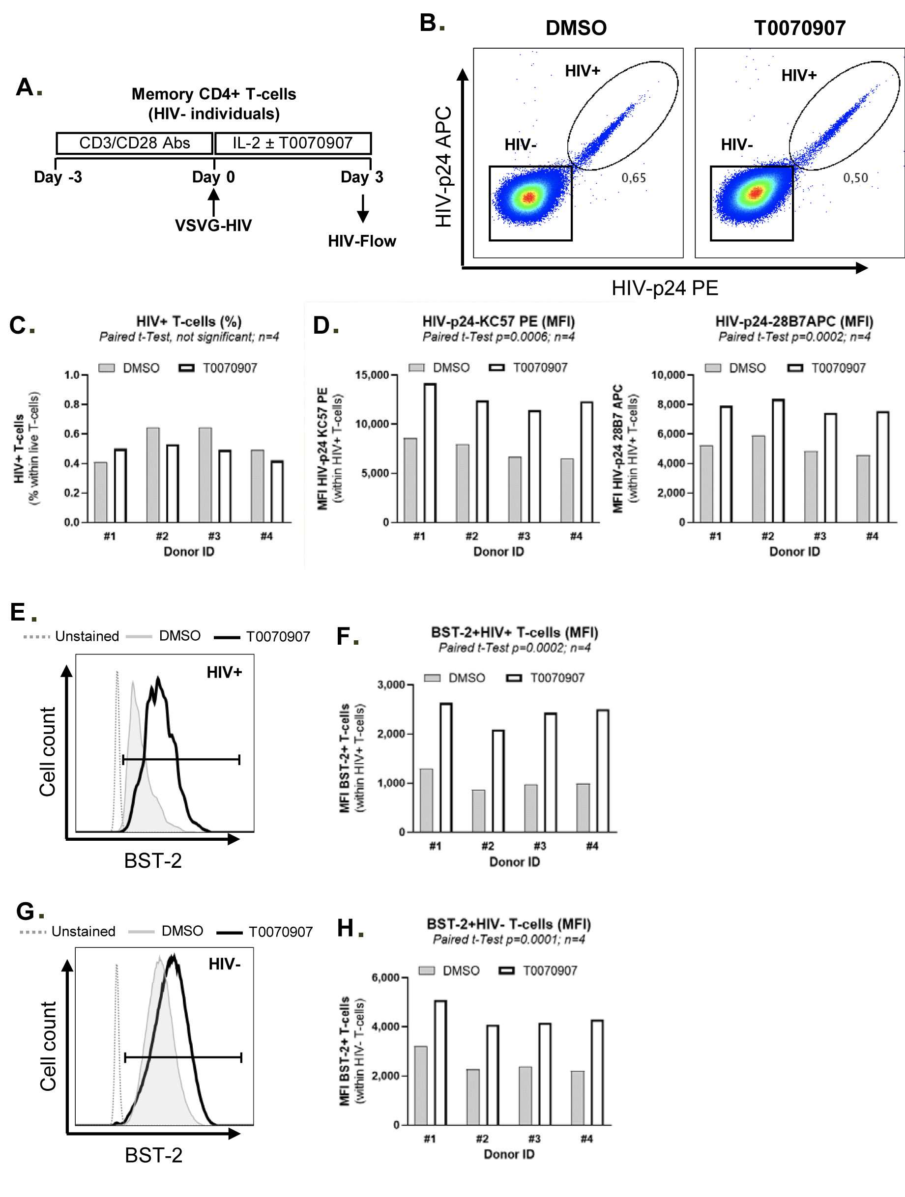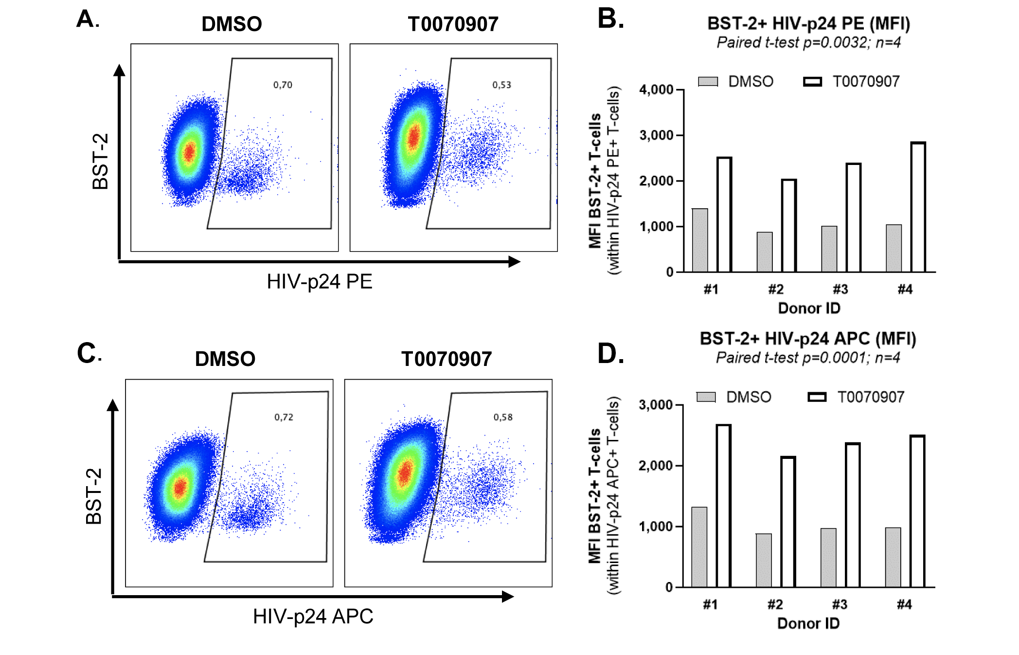Supplementary Figure 9. T0070907 prevents BST-2 downregulation on HIV-infected cells. Experiments were performed as described in Figure 7 legend. Shown are dot plots of BST-2 and HIVp-24 PE or HIV-p24 APC co-expression (A and C), as well as the statistical analyses for BST-2 expression (MFI) on HIV-p24 PE+ and HIV-p24 APC+ T different donors (B and D). Paired t-test values are indicated on the graphs.