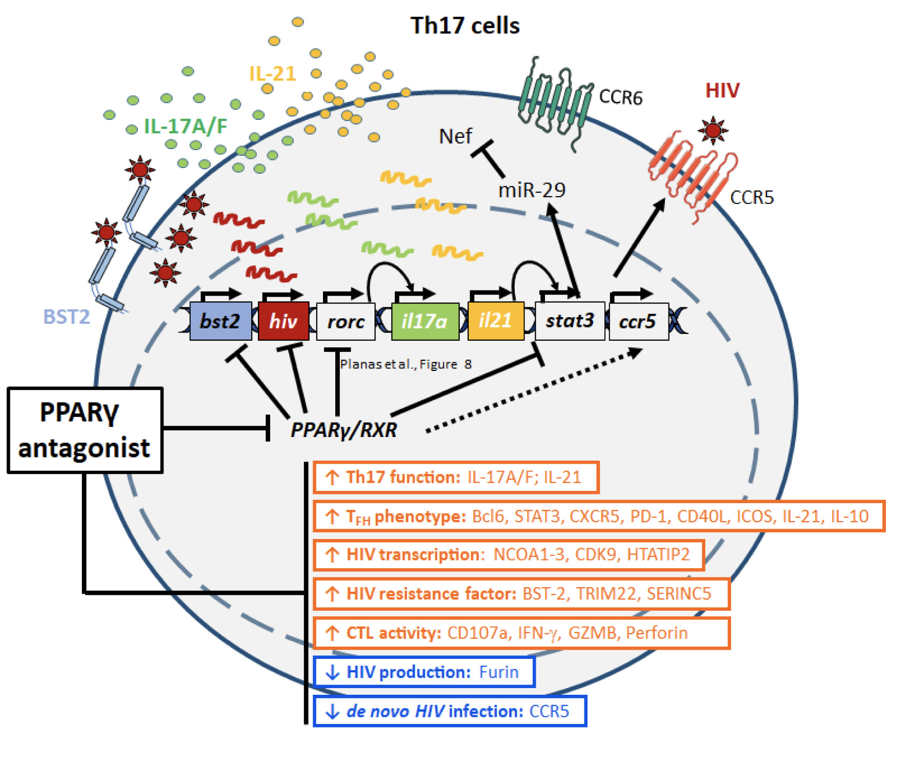 The frequency and functions of Th17-polarized CCR6+RORyt+CD4+ T cells are rapidly compromised upon HIV infection and are not restored with long-term viral suppressive antiretroviral therapy (ART). In line with this, Th17 cells represent selective HIV-1 infection targets mainly at mucosal sites, with long-lived Th17 subsets carrying replication-competent HIV-DNA during ART. Therefore, novel Th17-specific therapeutic interventions are needed as a supplement of ART to reach the goal of HIV remission/cure. Th17 cells express high levels of peroxisome proliferator-activated receptor gamma (PPARy), a transcriptional factor that represses the transcription of the HIV provirus and the rorc gene, which encodes for the Th17-specific master regulator RORyt/RORC2. Thus, we hypothesized that the pharmacological inhibition of PPARy will facilitate HIV reservoir reactivation while enhancing Th17 effector functions. Consistent with this prediction, the PPARy antagonist T0070907 significantly increased HIV transcription (cell-associated HIV-RNA) and RORyt-mediated Th17 effector functions (IL-17A). Unexpectedly, the PPARy antagonism limited HIV outgrowth from cells of ART-treated people living with HIV (PLWH), as well as HIV replication in vitro. Mechanistically, PPARy inhibition in CCR6+CD4+ T cells induced the upregulation of transcripts linked to Th17-polarisation (RORyt, STAT3, BCL6 IL-17A/F, IL-21) and HIV transcription (NCOA1-3, CDK9, HTATIP2). Interestingly, several transcripts involved in HIV-restriction were upregulated (Caveolin-1, TRIM22, TRIM5α, BST2, miR-29), whereas HIV permissiveness transcripts were downregulated (CCR5, furin), consistent with the decrease in HIV outgrowth/replication. Finally, PPARy inhibition increased intracellular HIV-p24 expression and prevented BST-2 downregulation on infected T cells, suggesting that progeny virion release is restricted by BST-2-dependent mechanisms. These results provide a strong rationale for considering PPARy antagonism as a novel strategy for HIV-reservoir purging and restoring Th17-mediated mucosal immunity in ART-treated PLWH.