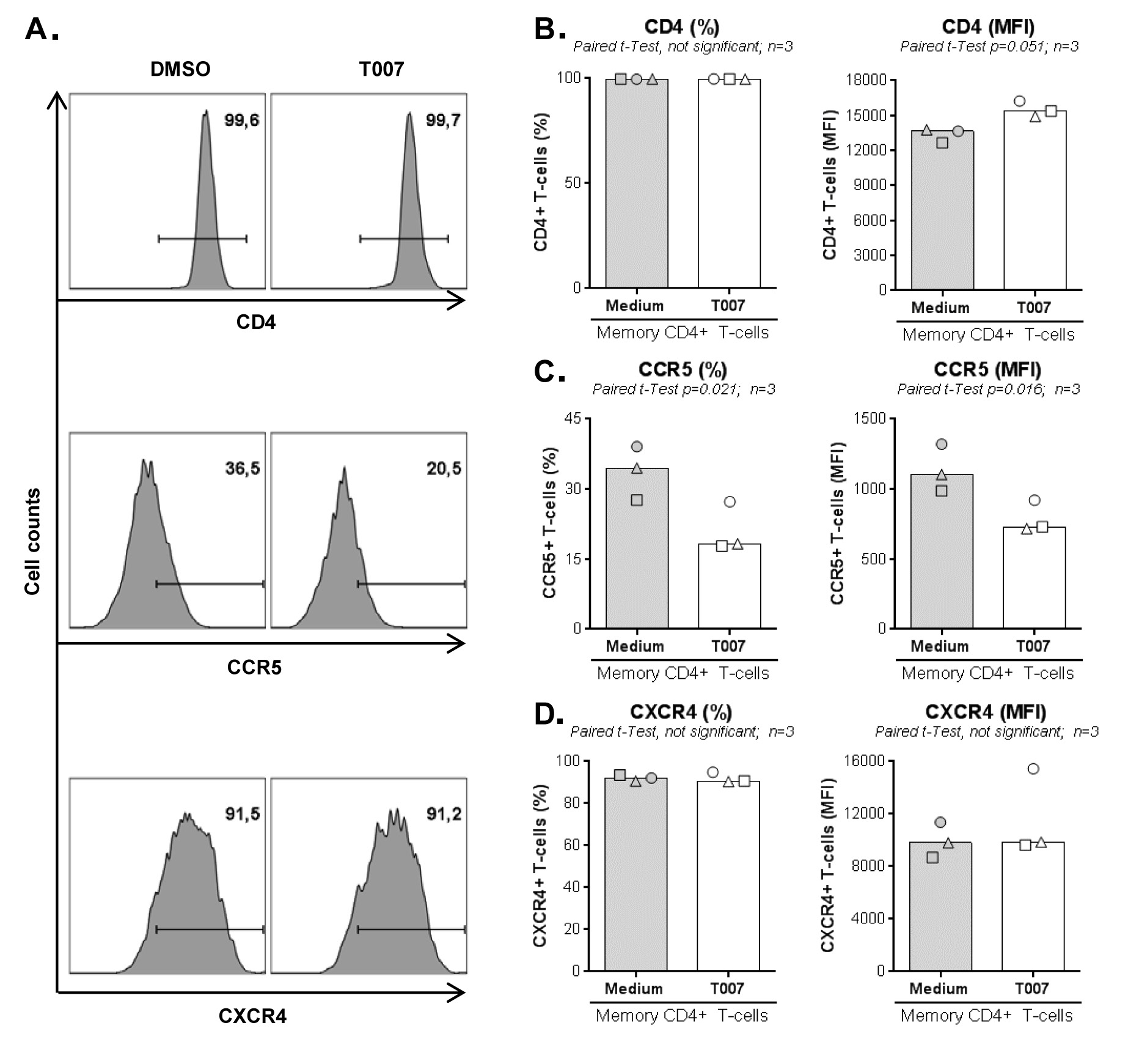 Supplementary Figure 4. T0070907 decreases CCR5 expression on memory CD4+ T cells. Memory CD4+ T cells from HIV-uninfected individuals were stimulated by CD3/CD28 for 3 days and then cultured in the presence/absence of T0070907 (10 µM) for 2 additional days. The expression of HIV-1 receptor CD4 and co-receptors CCR5 and CXCR4 was measured by flow cytometry. Shown are histograms from 1 representative donor (A), and the statistical analyses of CD4 (B), CCR5 (C), and CXCR4 (D) expression(% and MFI) in 3 different donors. Each symbol represents 1 different donor and bars represent median values. Paired t-test values are indicated on the graphs.