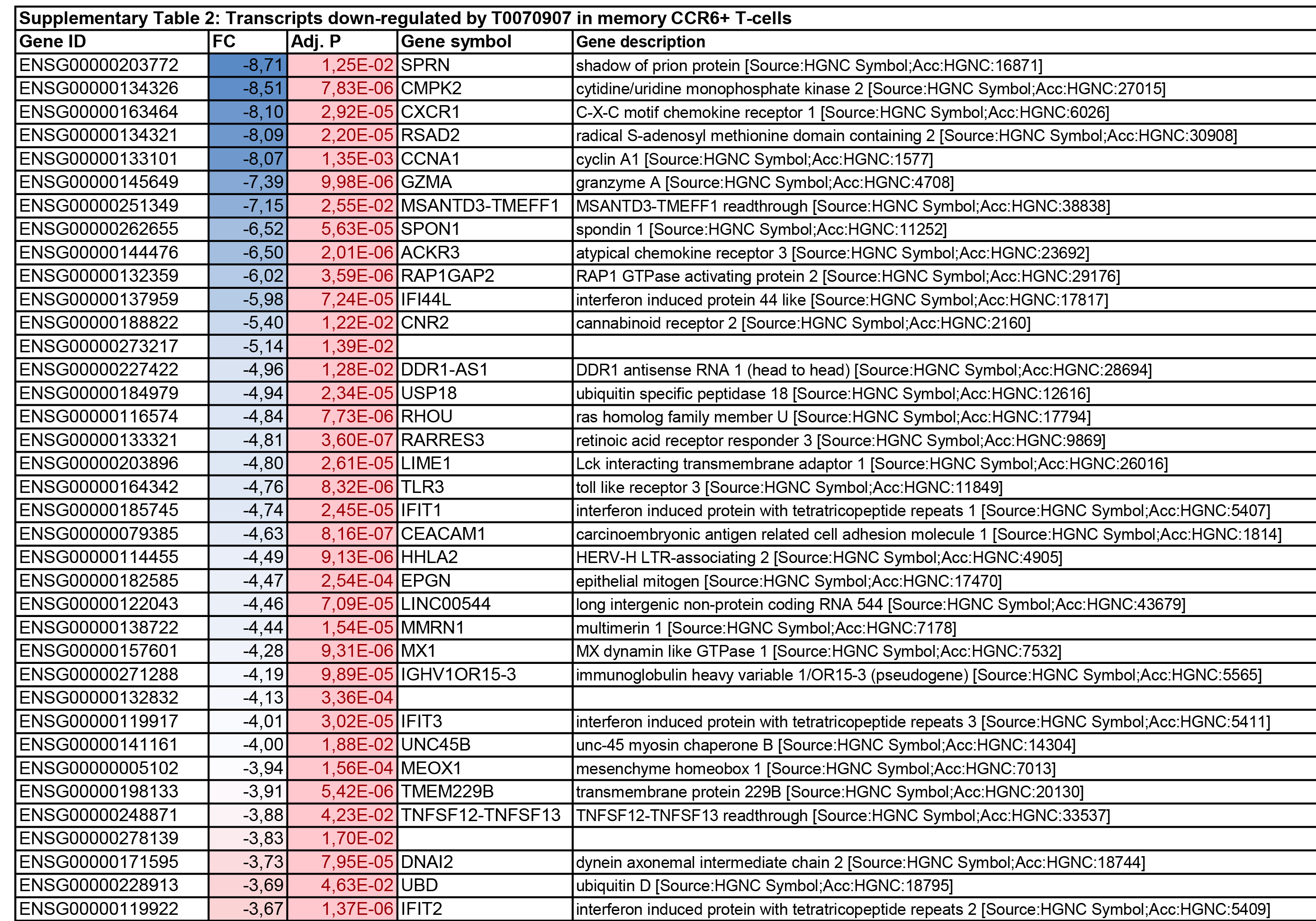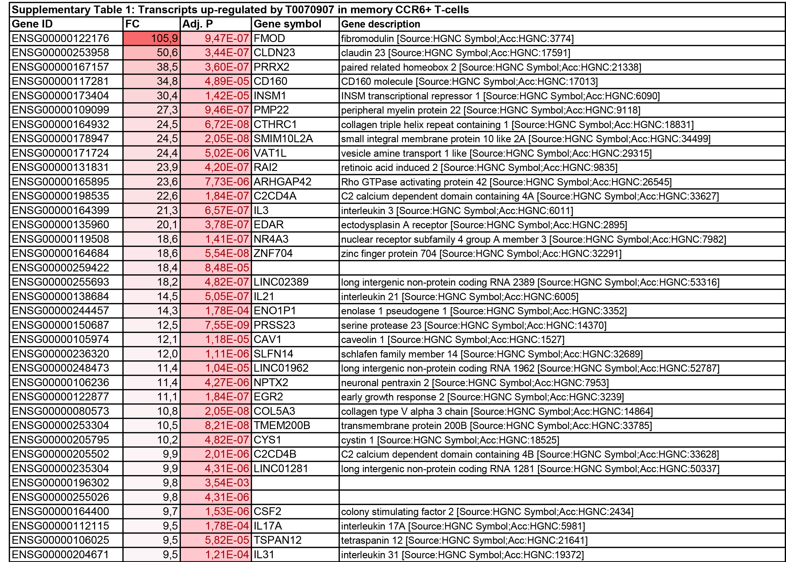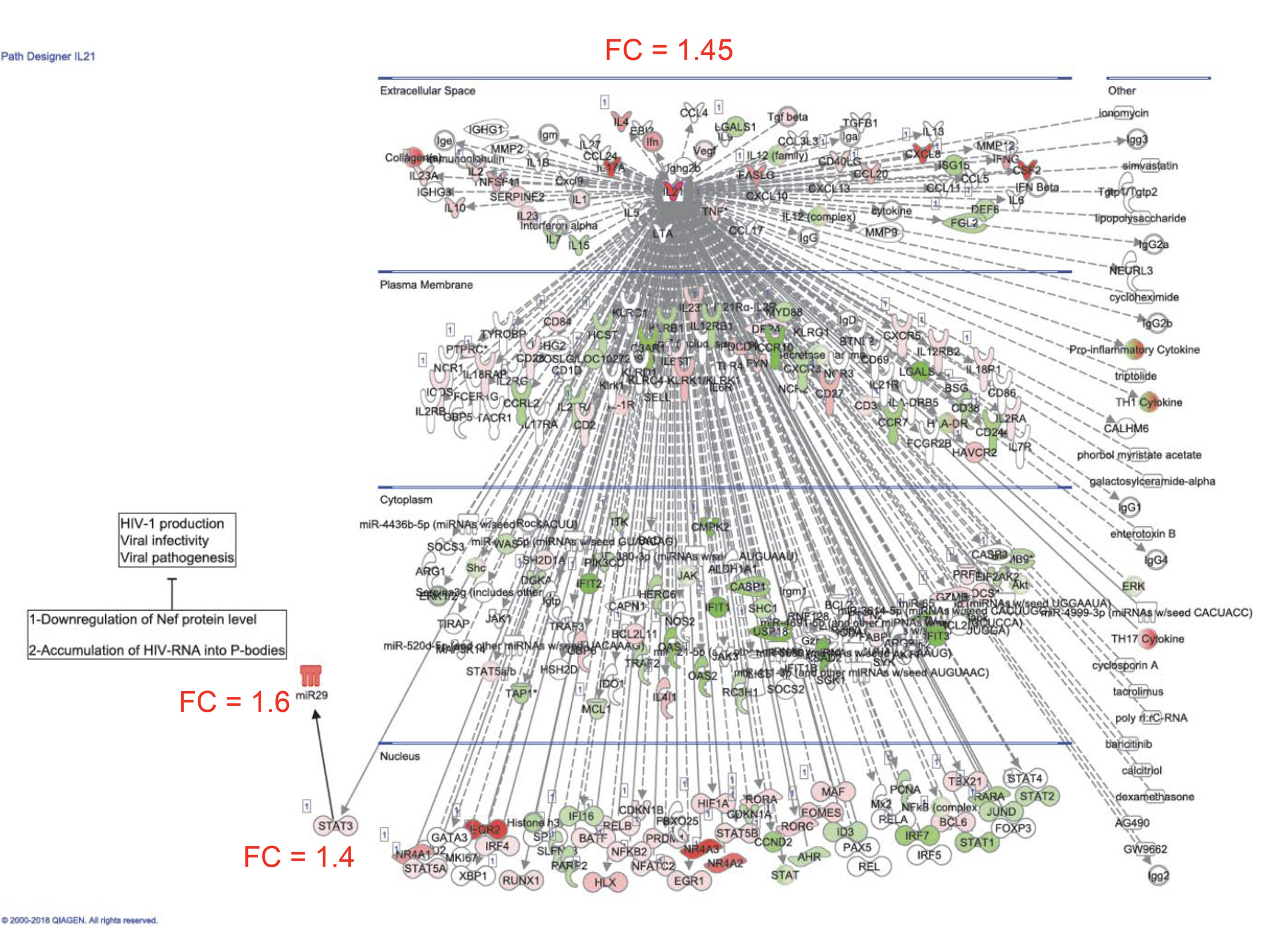 Supplementary Figure 6. Components of the IL-21 signalizing pathway modulated by T0070907 in CCR6+ T cells. RNA-Seq transcriptional profiles were generated as described in Figure 5. Ingenuity pathway analysis (IPA) was used to illustrate gene networks associated with IL-21. The color code is based on the expression FC in T0070907-treated CCR6+ versus untreated CCR6+ T cells (red and green for upregulated and downregulated transcripts, respectively). FC expression relative to IL-21, STAT3, and miR-29 in T0070907-treated versus untreated CCR6+ T cells are illustrated. The miR-29 connection to the IL-21 network was added manually based on a recent publication demonstrating that IL-21 regulates its expression by STAT3 (75).