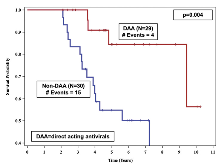 Methods: This is a retrospective follow-up study of 59 HCV-infected patients who underwent kidney transplant at the University of Alabama at Birmingham between 2007-2015 who were followed until the end of 2017. We examined the association of DAA-induced HCV cure with graft failure or death by survival analyses (Kaplan-Meier, Cox regression).