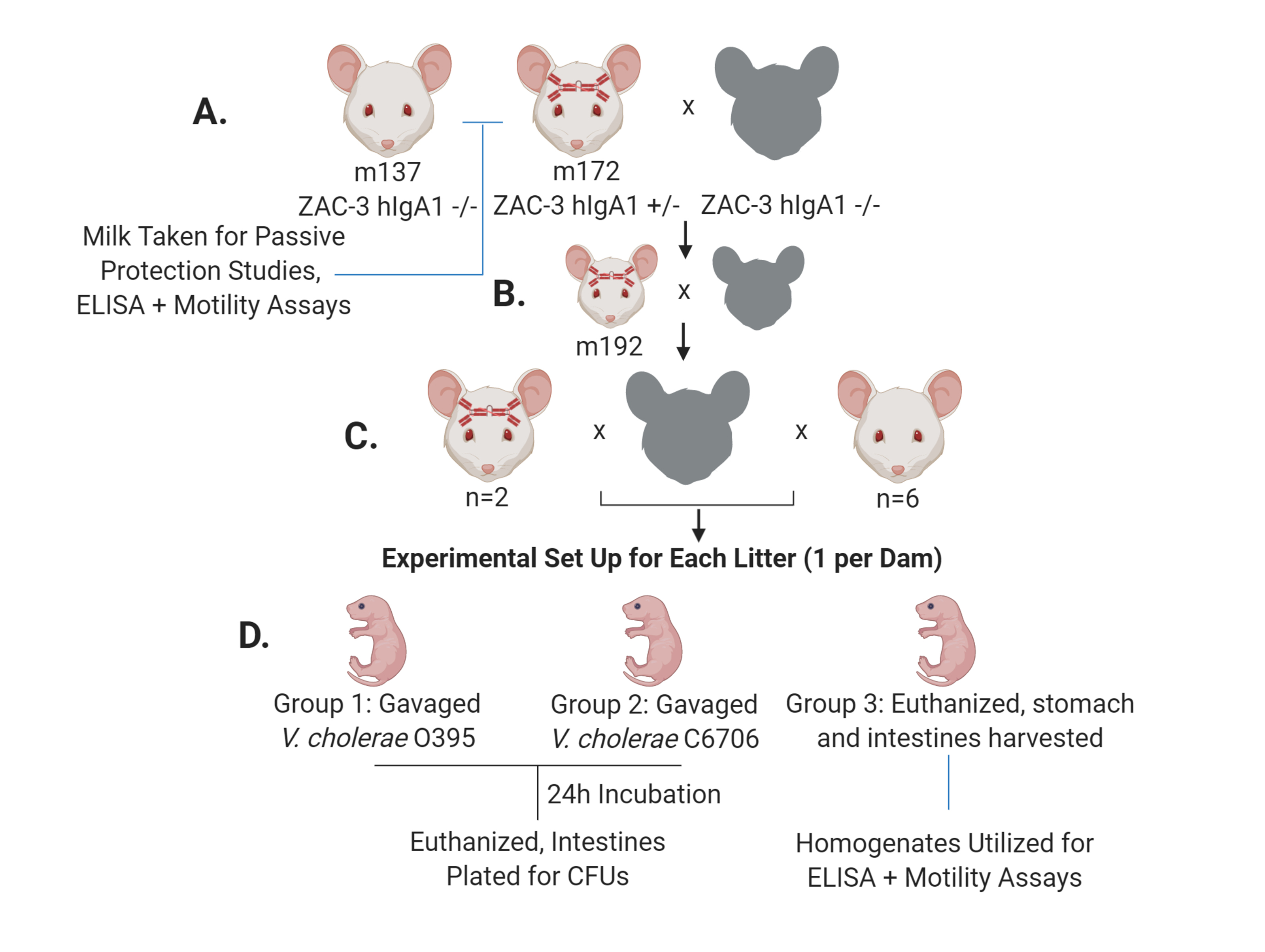 Figure 1. ZAC-3 hIgA Transgenic Mice Mating Scheme and Experimental Design. (A) Transgenic mouse m172, and a control mouse, m137, were bred with WT CD-1 males. Milk samples were taken for passive protection, ELISA and motility assays. (B) Resulting F1 progeny, m192, was bred with a WT CD-1 male. (C) From this pairing 8 F2 progeny females, 2 ZAC-3 hIgA positive, and 6 hIgA negative, were bred with WT CD-1 males. (D) F3 litters were taken at 4 to 5 days old for colonization experiments. Each litter, 1 per mating pair, was divided into 3 groups. At the time of gavage, Group 3 (1-2 pups depending on litter size) was euthanized, and stomach and intestines were excised and homogenized in PBS containing protease inhibitor. These homogenates were later used for ELISA and motility assays. Remaining litter mates were divided into Group 1 and 2, containing approximately equal numbers, and gavaged with ~1x 107 V. cholerae O395 or C6706 strains respectively. After 24-hour incubation, pups were euthanized and whole intestines were plated onto selective media for CFUs, which serve as a surrogate for intestinal colonization of V. cholerae. This figure was created with www.biorender.com.