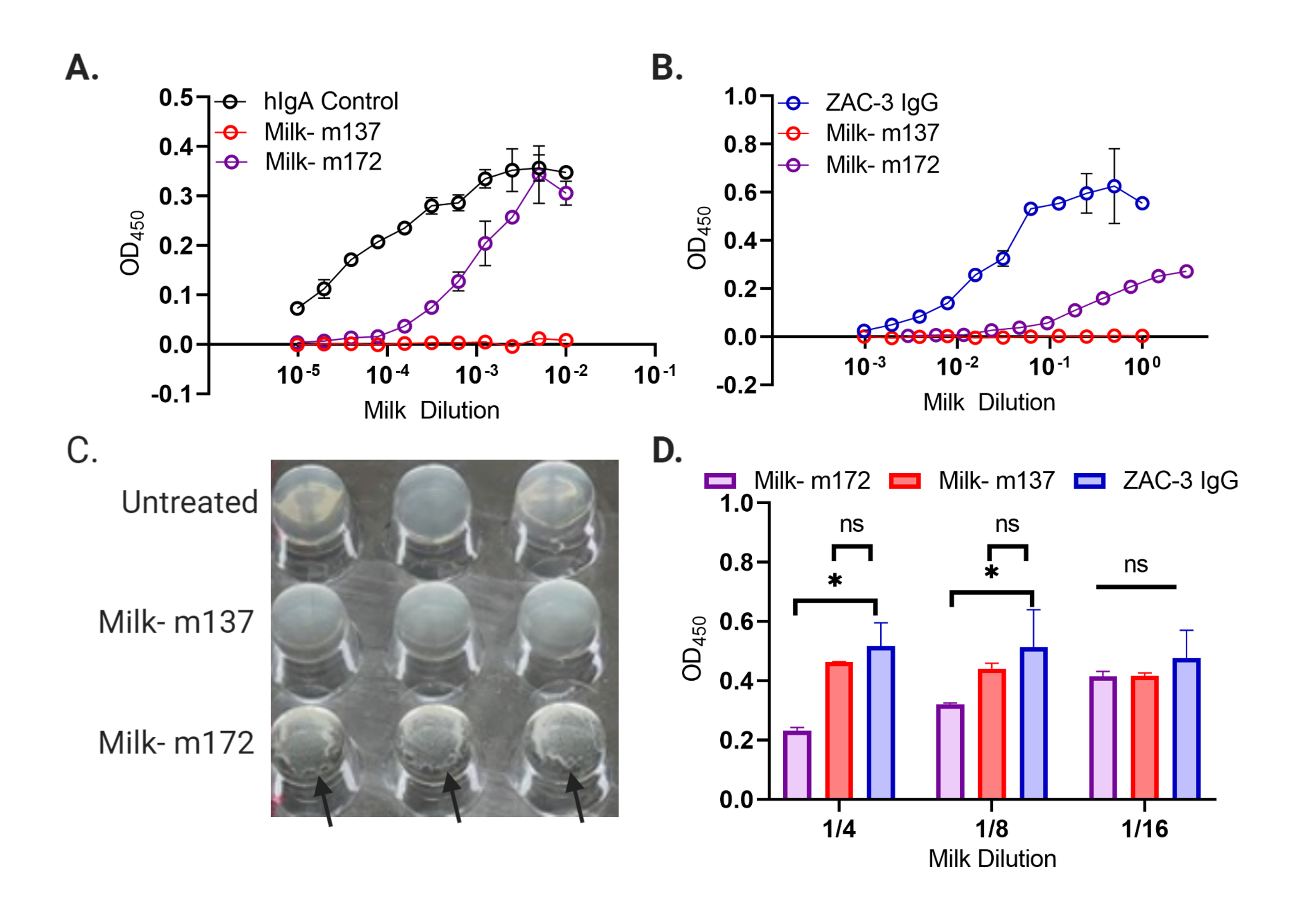 Figure 2. Transgenic Mice Secrete ZAC-3 hIgA that is Capable of Binding to and Agglutinating V. cholerae O1. (A) IgA sandwich ELISA to determine the concentration of hIgA in milk samples. In comparison to control human IgA from colostrum, milk from m172 exhibited above background binding to anti-human IgA ELISA plates, while milk from m132 did not. (B) Whole cell ELISA coated with V. cholerae O395 cells. Milk from m172 exhibited above background binding to V. cholerae O395 while milk from m137 did not. ZAC-3 IgG (Diluted 1:2 starting at a concentration of 10 µg/mL) was included as a control for V. cholerae binding. (C) Mid-log phase V. cholerae O395 were mixed with a 1:1600 dilution of milk from either m137 or m172 for 2 hours at 37◦C and monitored for macroagglutination. Black arrows indicate where cells treated with milk from m172 aggregated at the bottom of the wells, suggesting antibody in milk can crosslink V. cholerae cells and cause them to settle out of solution. (D) Competition ELISA between ZAC-3 IgG and milk containing ZAC-3 hIgA from m172 or control milk. Plates coated with whole V. cholerae O395 cells were incubated for 1 hour with ZAC-3 IgG at 0.1 µg/mL, then milk from m172 or m137 was added at indicated dilutions for 1 hour. ZAC-3 IgG was detected and milk from m172, not m137, significantly inhibited binding of ZAC-3 IgG to whole V. cholerae cells, indicating that ZAC-3 hIgA can compete with ZAC-3 IgG for binding. Statistical significance was determined using 2-way ANOVA followed by Tukey multiple comparison test, *P<0.05. All data comprised at least 2 technical replicates that are representative of at least 2 biological replicates.