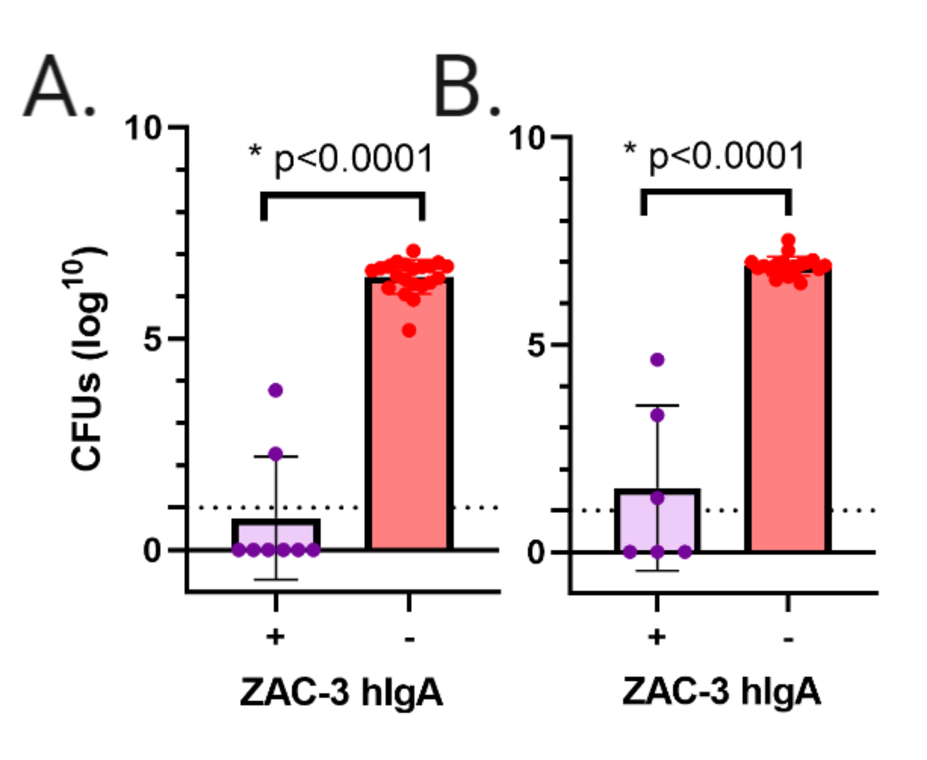 Eight litters of pups were gavaged with V. cholerae strains O395 or C6706. Among these litters, 2 were ZAC-3 hIgA positive and 6 were hIgA negative. Pups gavaged with V. cholerae strains O395 or C6706 were euthanized after 24 hours, at which time intestines were excised, homogenized, and plated on LB agar to enumerate V. cholerae CFUs as a surrogate for colonization. Pups gavaged with V. cholerae strains O395 or C6706 in the ZAC-3 hIgA-positive group showed a significant reduction in colonization in both strains in comparison to the hIgA- negative groups (Figure 3).