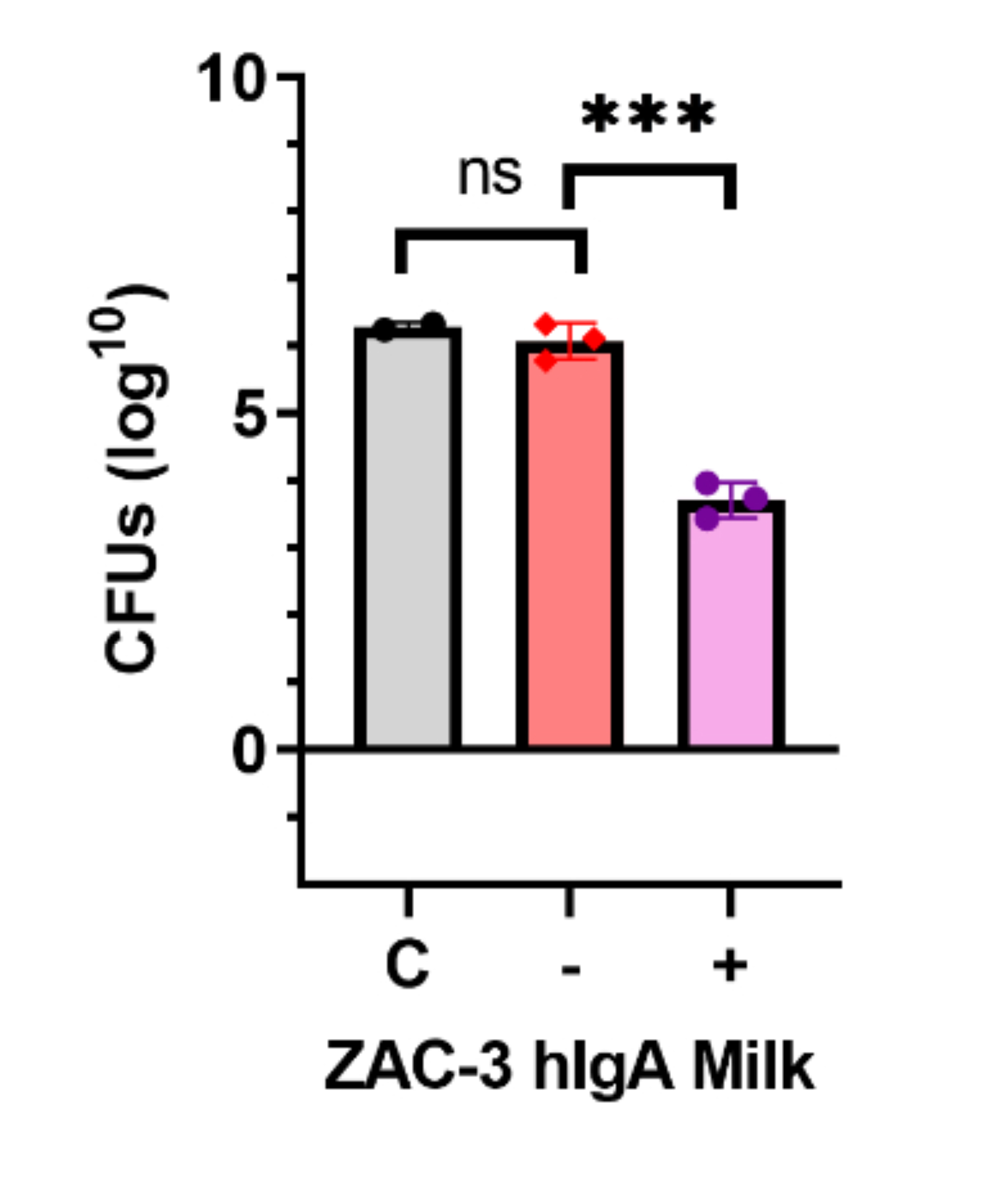 We next performed passive transfer studies to ensure that the milk from the ZAC-3 hIgA1 transgenic dams, and not another variable, was responsible for protection against V. cholerae colonization. ZAC-3 hIgA1-containing milk, or control milk was diluted 1:100 (3-6 µg/mL), mixed with V. cholerae O395 and administered to 4-day-old BALB/c pups. Pups treated with ZAC-3 hIgA1-containing milk exhibited a 2-log reduction of CFUs in intestinal homogenates compared to pups treated with control milk (Figure 4). Together these data show that pups fed from transgenic ZAC-3 hIgA1 dams contain milk that is positive for hIgA and exhibit decreased colonization in comparison to pups fed from hIgA-negative dams.