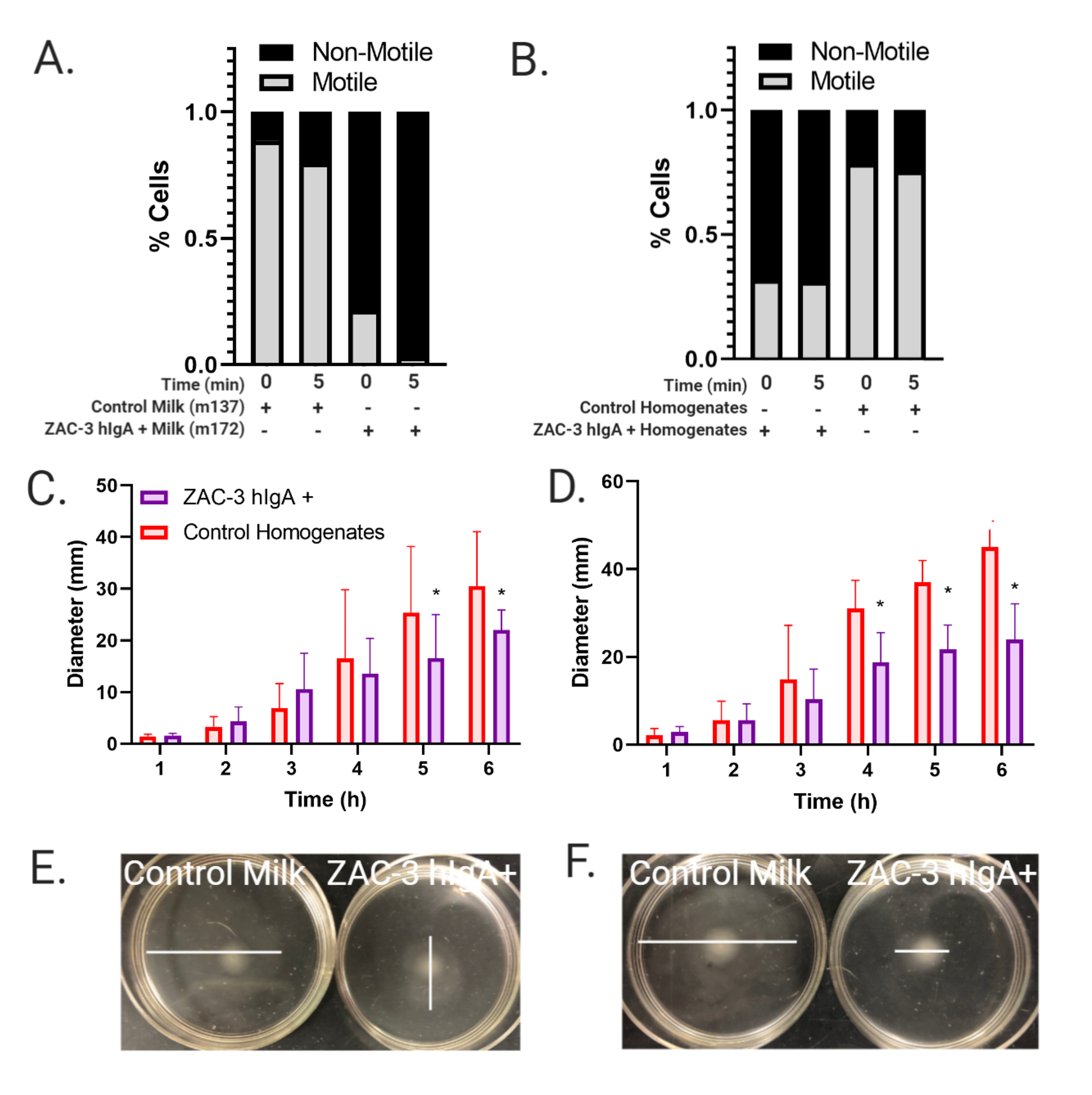 Figure 5. ZAC-3 hIgA in Milk Inhibits Motility of V. cholerae O1. (A) Liquid motility assay, whereby mid-log phase V. cholerae O395 were treated with a 1:100 dilution of control milk, from m137, or ZAC-3 hIgA-containing milk from m172 and imaged for 10 seconds at both 0 and 5 minutes post treatment. Motile bacteria were counted as those that were seen to move between frames by hand. There is a significant decrease (P<0.005) in motility in V. cholerae treated with ZAC-3 hIgA-positive milk in comparison to control milk at both 0- and 5-minutes post treatment. Data comprised 3 technical replicates. (B) Liquid motility assay was performed as described, with V. cholerae O395 expressing mCherry treated with either a 1:100 dilution of stomach homogenates from pups fed from control dams or those secreting ZAC-3 hIgA for 5 minutes. We see a significant reduction (P<0.05) in motility between V. cholerae treated with ZAC-3 hIgA positive stomach homogenates vs control homogenates at both 0- and 5-minutes post treatment. Data comprised at least 3 videos, from bacteria treated with at least 3 different stomach homogenates. Significance was determined using 1-way ANOVA followed by Tukey’s multiple comparison test. (C, D) Semi-solid agar assay (ssAgar), whereby a colony of either V. cholerae (C) O395 or (D) C6706 from an LB agar plate was stabbed into the center of a dish containing 3% LB agar plus either a 1:150 dilution of control or ZAC-3 hIgA-positive stomach homogenates, and the diameter of growth was measured every hour as a method to measure inhibition of motility. Cells treated with ZAC-3 hIgA-positive milk exhibited significant reduction P<0.05) in motility in comparison to control milk samples at hour 5, and at hour 6 for O395 and at hours 4, 5, and 6 for C6706. Data comprised 1 biological replicate in triplicate per stomach homogenate, with at least 3 homogenates per treatment. Significance was determined using 2-way ANOVA followed by Tukey’s multiple comparison test. (E, F) Representative images of 1 technical replicate from 1 treatment group at 6 hours post treatment. White lines indicate widest diameter of growth.