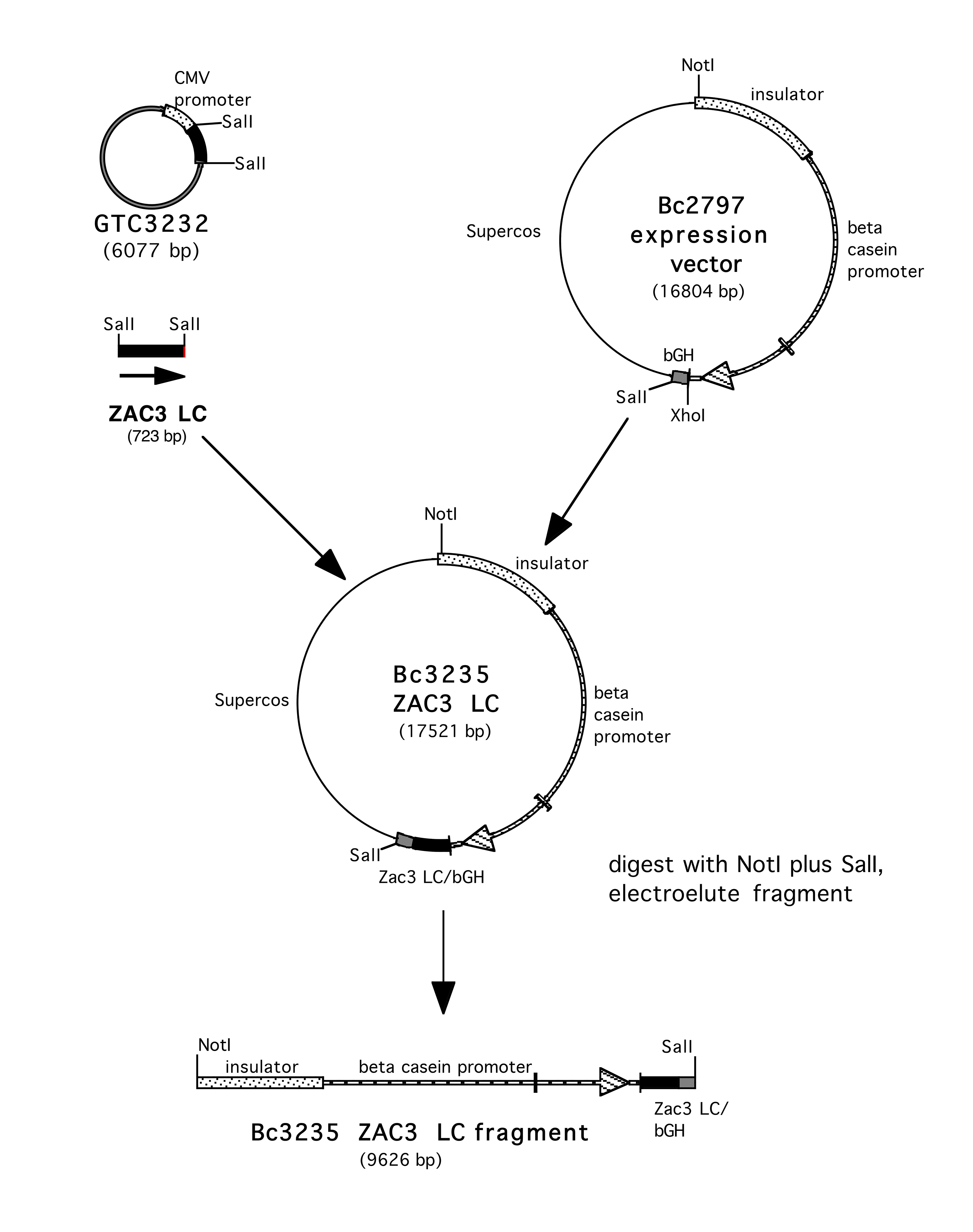 Supplementary Figure 5. Micro-injection Fragments BC3239 LC/J, BC3242 HC. The fragments for microinjection were isolated from the prokaryotic SuperCos vector by digesting the plasmids with restriction enzymes that flank the inserts. NruI, which cuts the SuperCos plasmid was also used. The Bc3239 LC/J chain and BC3242 HC were both digested with NotI, NruI, and the expression constructs were isolated by gel electrophoresis from the prokaryotic SuperCos fragments.