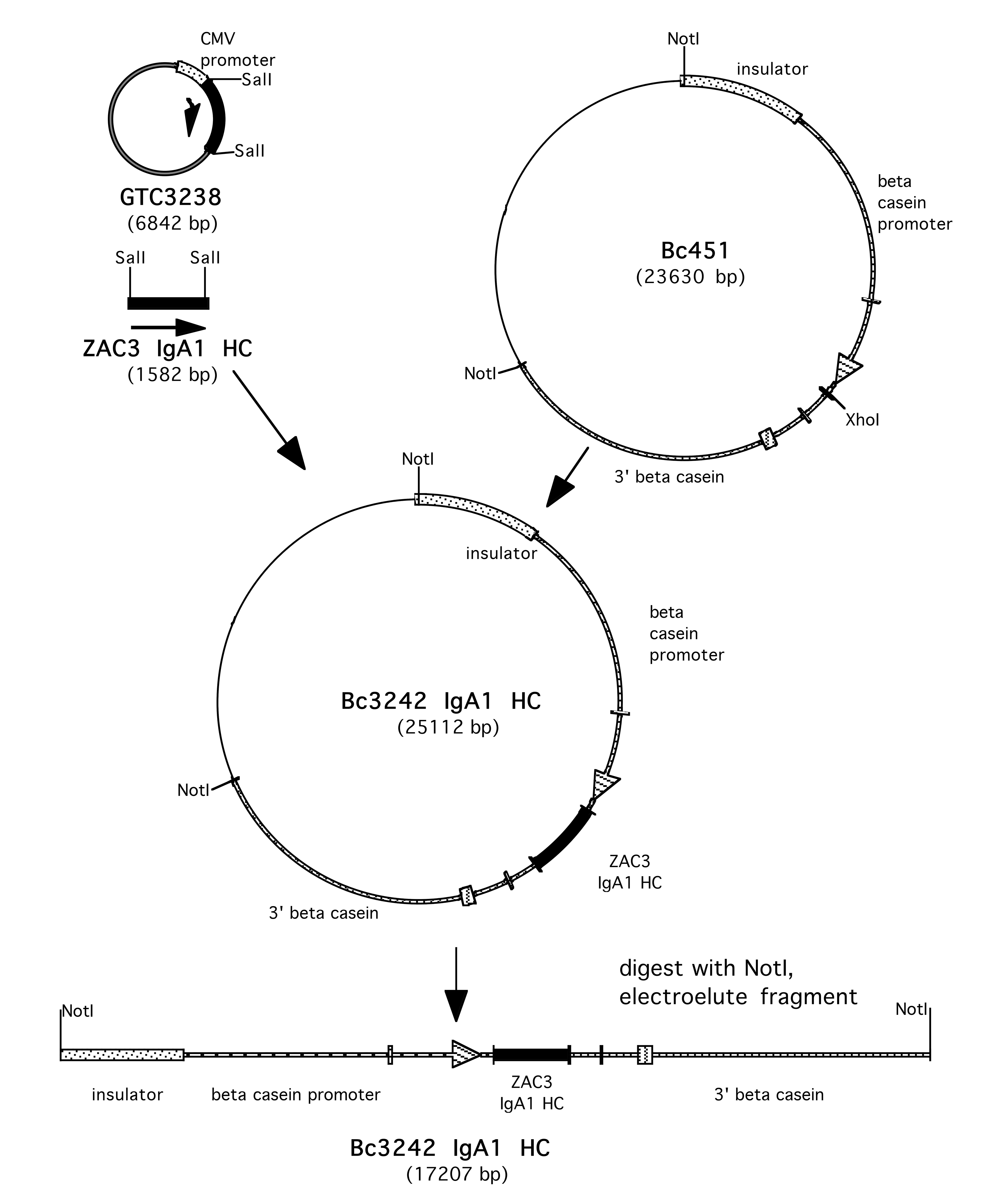 Supplementary Figure 1. Construction of BC3242 IgA1 HC. The sequence of the ZAC3 Vibrio cholerae antibody heavy chain was obtained from published sequences. The sequence was reverse translated, the DNA optimized, and synthesized by GeneArt, (Thermo Fisher). The HC sequence was obtained as a SalI 1.5kb fragment in the mammalian expression vector pcDNA3—3238 HC. This SalI fragment was isolated and ligated into the XhoI site of the beta casein expression vector BC451 to yield BC3242 IgA1 HC.