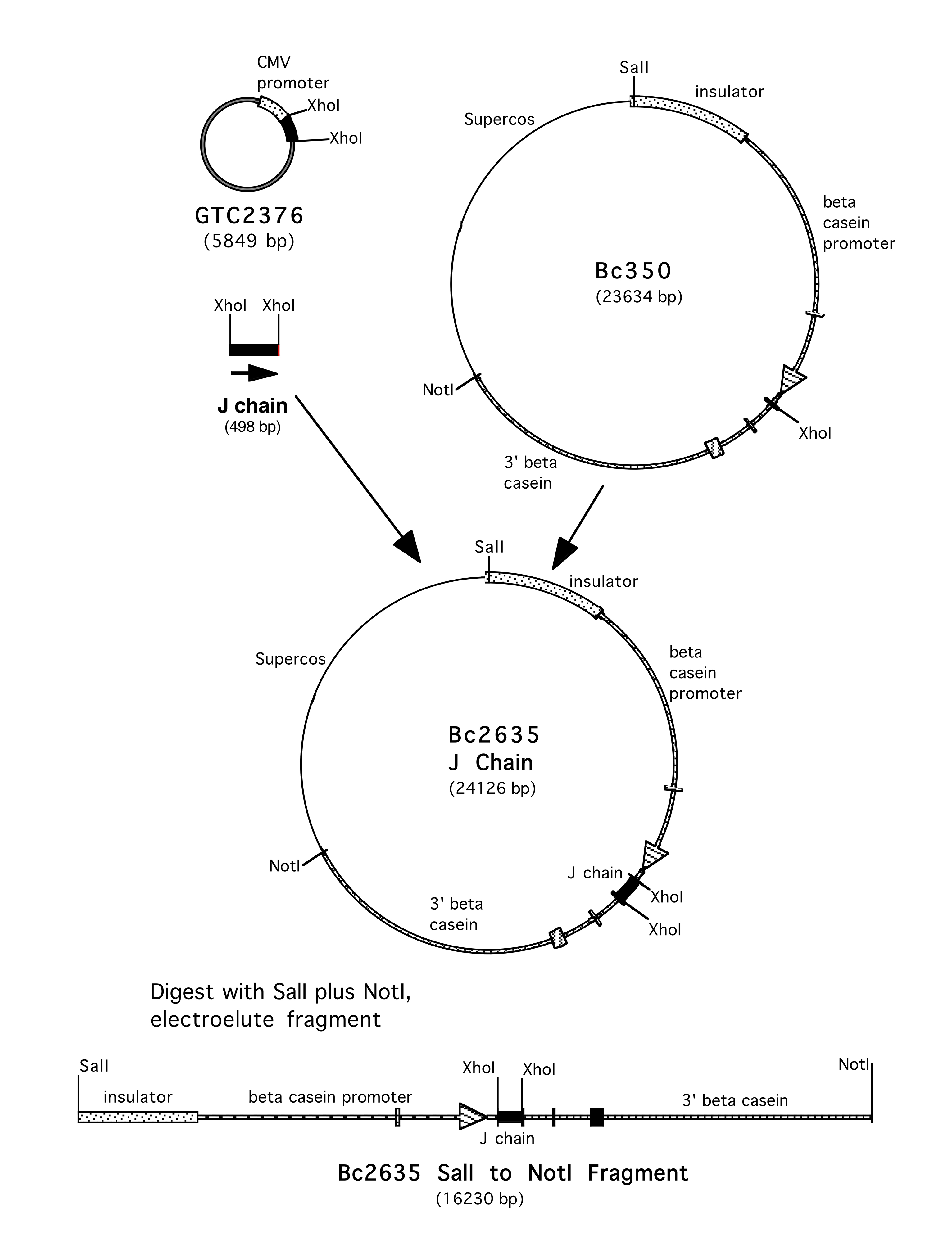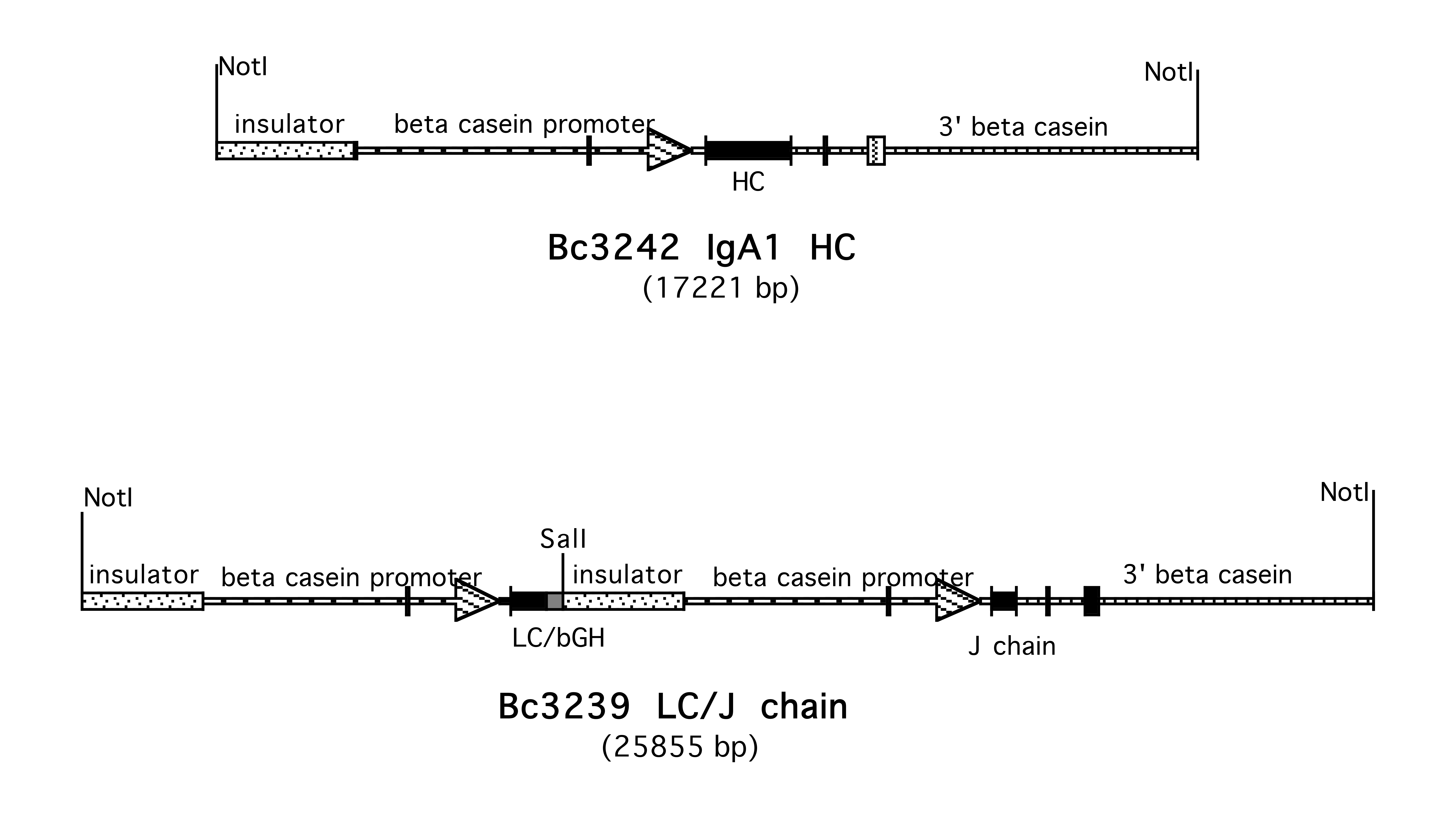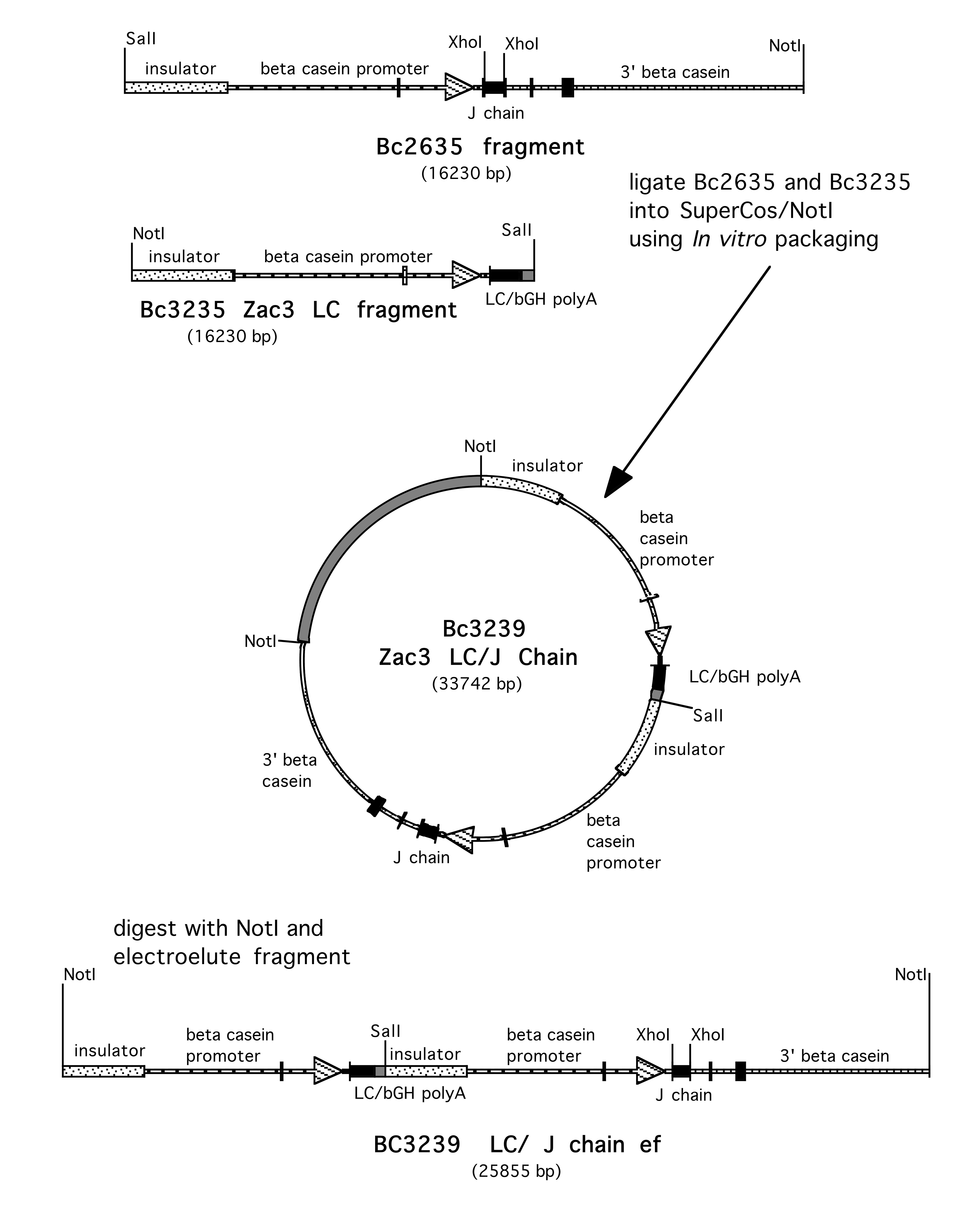 Supplementary Figure 4. Construction of BC3239 IgA LC/J Chain. To aid in micro-injection, the constructs carrying the LC and J chain were linked. The NotI-SalI fragment of BC3235 was isolated from the SuperCos bacterial vector. The SalI-NotI fragment containing the J chain was also isolated from BC2635. These 2 fragments were ligated together cloned into SuperCos using the lambda IVP system. The resulting plasmid, BC3239 carries both constructs as a 26 kb NotI insert.