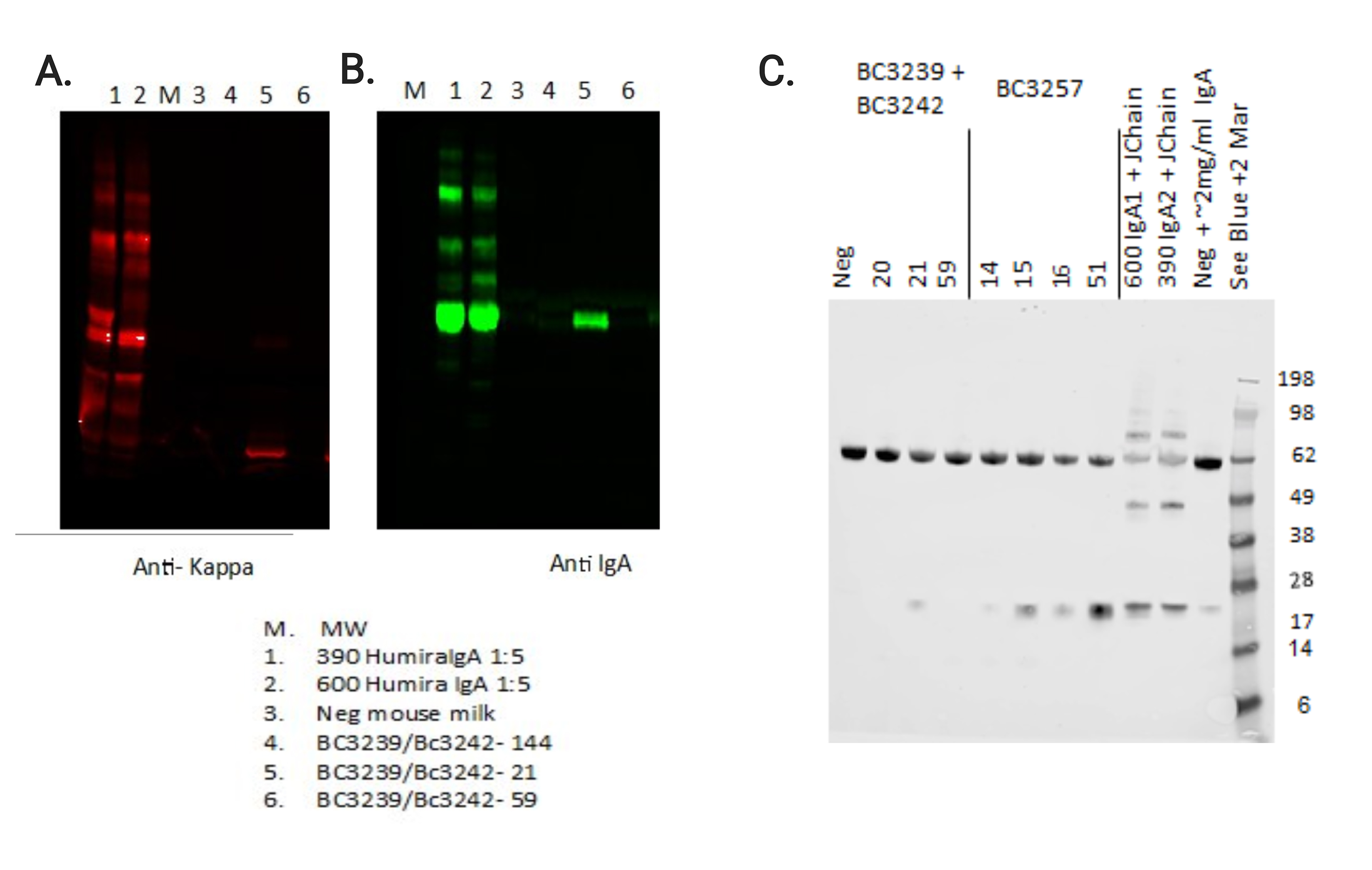 Supplementary Figure 6. Western blots confirm the presence of HC, LC, and J chain. Milk samples from control mice secreting HUMIRA IgA, previously unpublished, or ZAC-3 hIgA1 founder females, numbers 144, 21, 59 containing the BC3239 and BC3242 constructs were analyzed via western blot for (A) Kappa light chain and (B) human IgA. Lanes 1, 2, containing positive control Human IgA and lane 5, containing milk from founder female 21, exhibit highly positive signal for both Kappa LC and IgA. (C) Western blot showing that milk from mouse 21 is also positive for J-chain in comparison to positive controls. Data in (C) also includes preliminary findings from ZAC-3 IgA2 constructs, mouse numbers 14, 15, 16, 51, which were not pursued. ZAC-3 hIgA founder female 21 was subsequently bred.