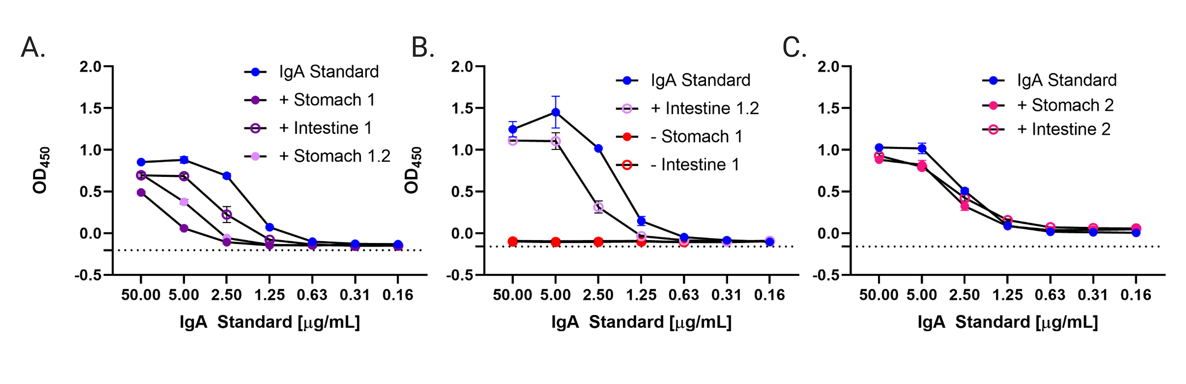 Supplementary Figure 7. Stomach and Intestinal Homogenates from Neonatal Mice Contain human IgA. Stomach and intestinal homogenates from pups suckled on ZAC-3 hIgA+ and hIgA- dams were analyzed by human IgA sandwich ELISA. Samples from a total of four pups were analyzed. A mouse suckled on an hIgA- dams (panel A, red symbols), two littermates (mice 1.1, 1.2) from a single hIgA+ dam (panels A, B) and a single mouse from a second litter (2.1; panel C). Human colostral IgA was used as a standard. mice Data are comprised of 1 biological replicate and 2 technical replicates.