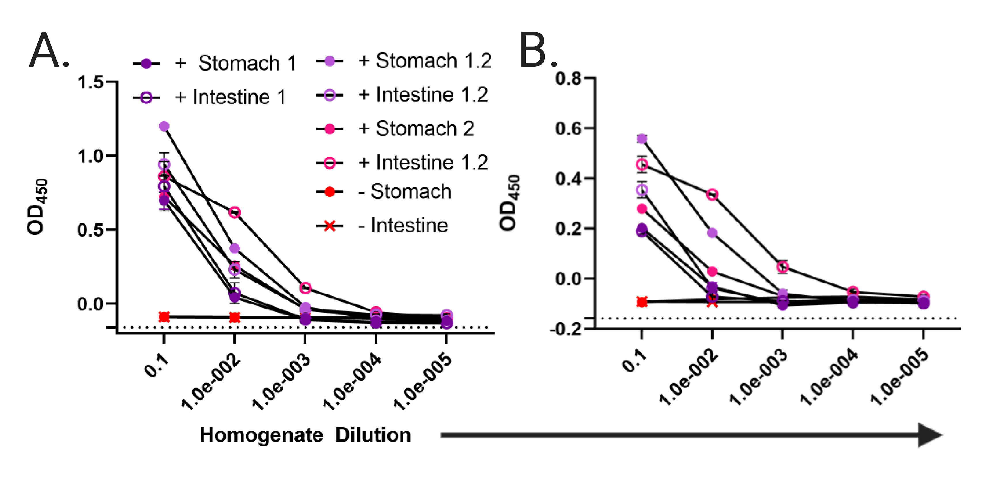 Supplementary Figure 8. IgA in Stomach and Intestinal Homogenates Binds V. cholerae O395 and C6706. Whole cell ELISA with plates coated with either V. cholerae (A) classical Ogawa strain O395 or (B) El Tor Inaba strain C6706. Stomach and intestinal homogenates were diluted 1:10, and then 1:10 across the plate. Only homogenates from pups fed by ZAC-3 hIgA positive dams exhibit above background binding to whole V. cholerae cells. Labels are the same as in Figure S7. Again, homogenates from 1 pup fed from a WT dam were included as a reference. Each individual ELISA was conducted once with 2 technical replicates.