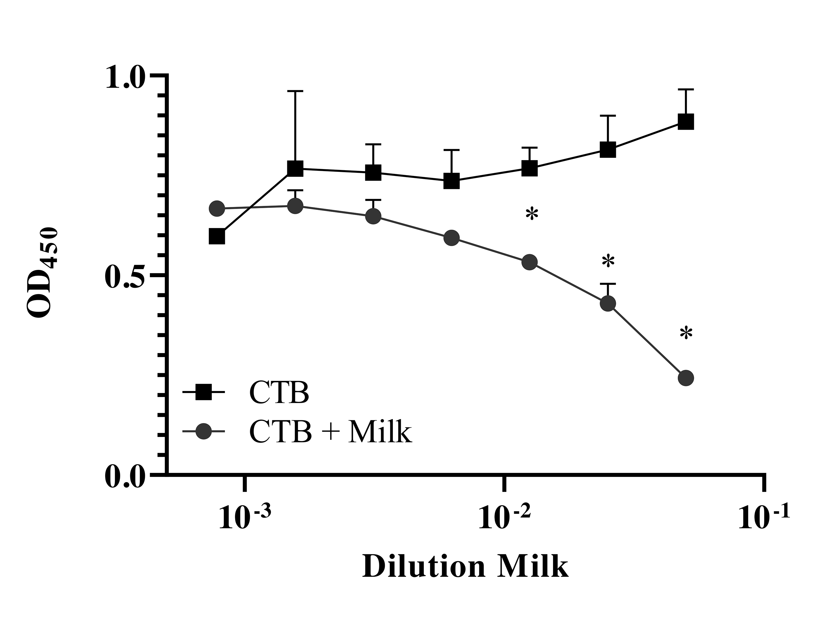 Supplementary Figure 9. Mouse Milk Competes with CT-B subunit for Binding GM-1. Our data support previous findings [40]. Cholera toxin B subunit (Millipore Sigma, Cat. No. C9972), at 10 µg/mL, was mixed with WT milk (1:50 serial dilution, diluted 1:2 down the plate) for 1 hour, and then incubated with GM-1 coated ELISA plates for 1 hour (Sigma-Aldrich, Cat. No. 37758-47-7). There was a significant inhibition of CT-B binding to GM-1 in milk. Plates were developed as described in the materials and methods section. The experiment was performed in duplicate twice. (*P<0.05). Significance was determined by 2-way ANOVA followed by Sidak’s multiple comparison test.