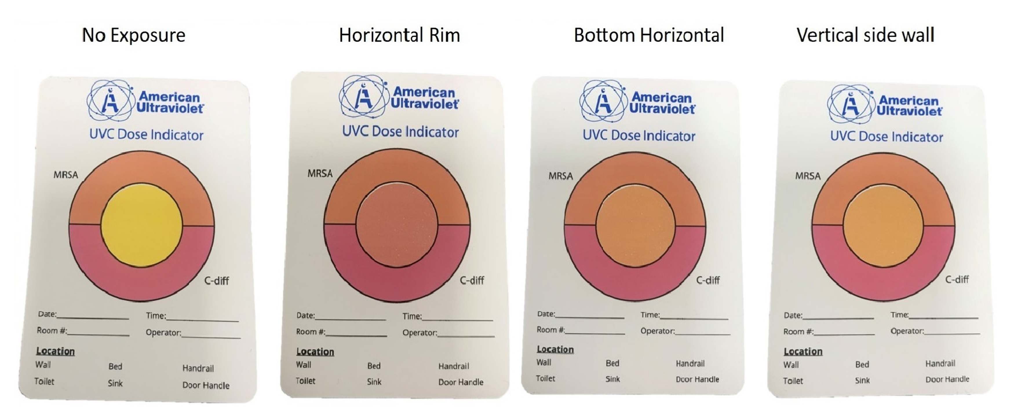 Figure 3 shows changes in the UV-C colorimetric indicators with the 30-second duration UV-C treatment at each inoculum site. The 30-second treatment resulted in a color change from yellow (untreated) to orange indicating delivery of a sufficient dose to reduce MRSA at each test location.