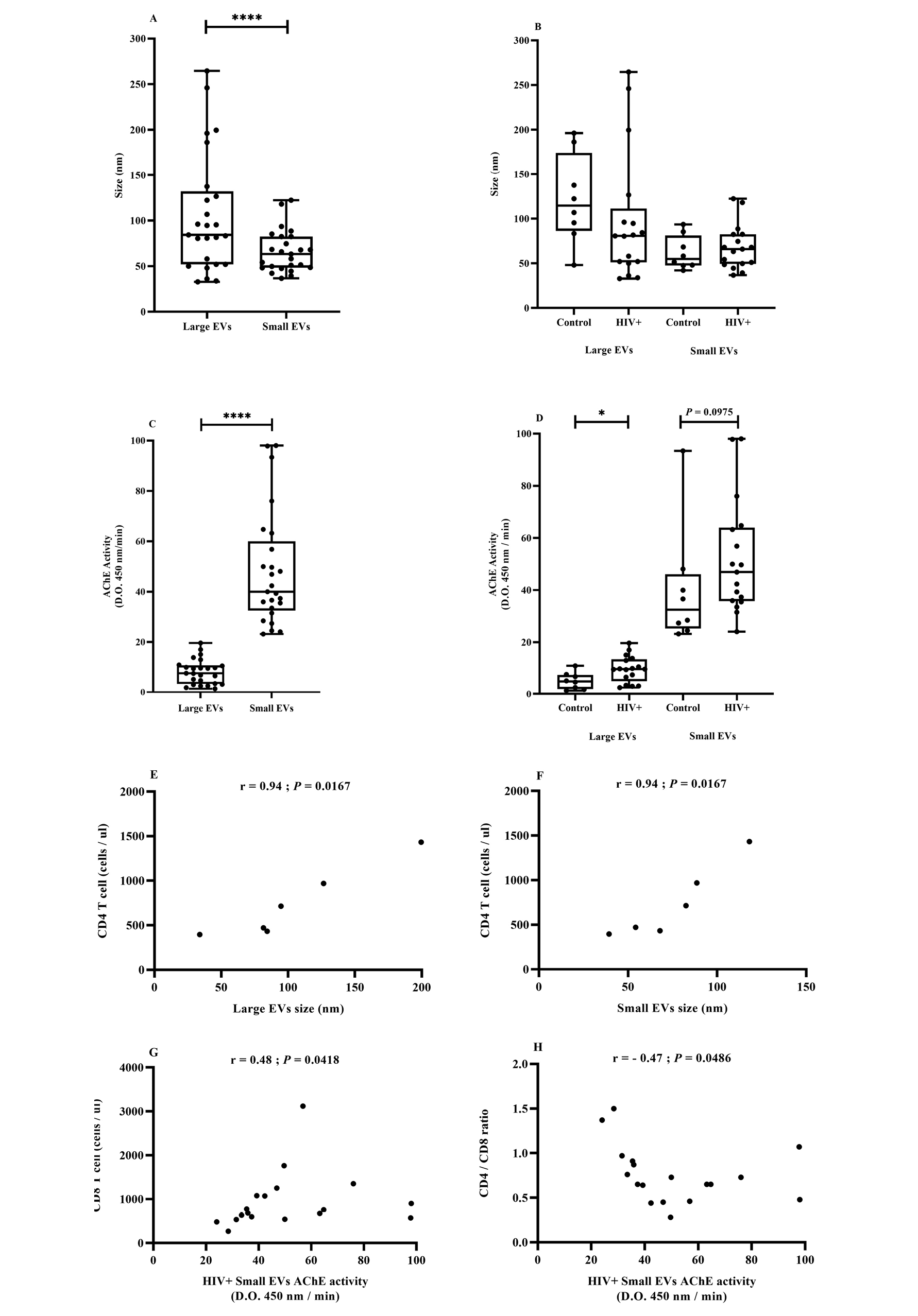 Results: HIV infection induces increased production of small EVs in plasma. EV subtypes were differentially enriched in miR-92, miR-155, and miR-223. Positive correlations between CD8 T-cell count and large EVs abundance and small EVs AChE activity were observed. CD4/CD8 ratio was negatively correlated with small EV AChE activity, and miRNA-155 level per small EV was negatively correlated with CD8 T-cell count.
