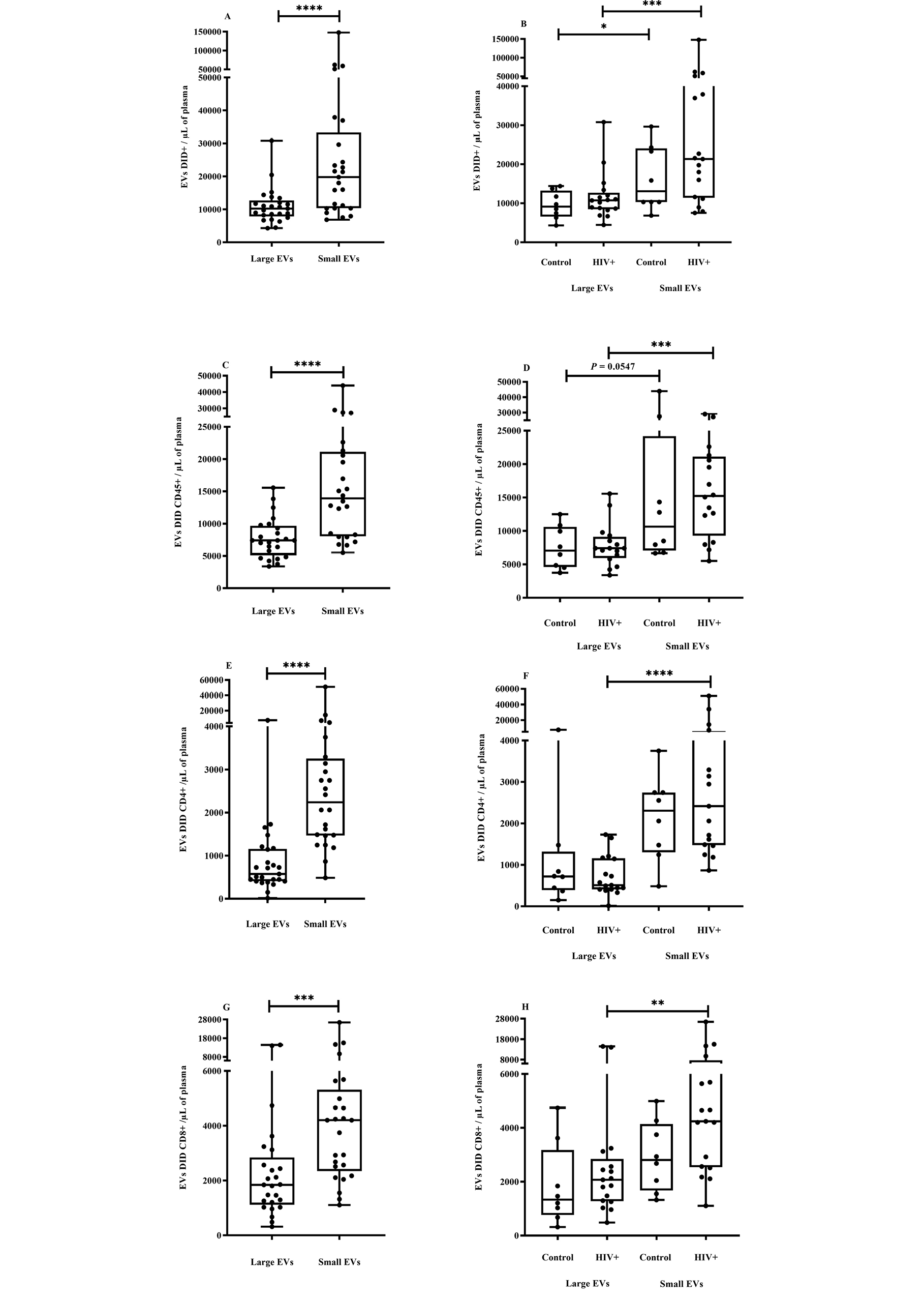 Since antiretroviral therapy (ART) does not significantly reduce the generalized immune activation and inflammation during human immunodeficiency virus (HIV) infection [1, 2], it is necessary to identify factors that underlie this persistent inflammation. Reliable biomarkers of treatment effectiveness and residual immune activation and inflammation will be essential to improve patient quality of life. Potential biomarkers begin to appear in the plasma during the early stages of infection. Membranous subcellular bodies called extracellular vesicles (EVs) are secreted during communication between dendritic cells, CD4 T cells, and other immune cells that play roles in HIV infection progression [3-9]. EVs can be recovered from body fluids such as blood, plasma, serum, urine, saliva, amniotic fluid, and breast milk [10]. Since their membrane, protein, and RNA composition reflect those of the cells or tissue of their origin, EVs may indicate the disease status [11-13]. Thus, they could become biomarkers for non-invasive investigations and clinical diagnostics and prognostics for pathogenesis, immune activation, inflammatory status, and perhaps ART resistance [14].