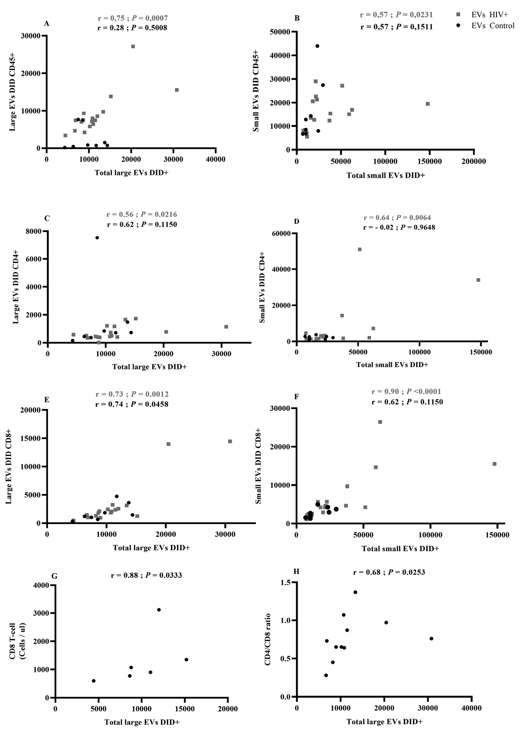 Despite the great interest in EVs in various pathological conditions, their isolation and nomenclature have yet to be standardized [68]. While many studies focus on exosomes, EVs are highly diverse, and it is crucial to consider differences in the secretion mechanisms and contents of their subtypes from one disease stage to the next [69]. According to our hypothesis, depending on the biogenesis mode, specific EV types contain miRNA that leads to increased CD8 T-lymphocyte counts that characterize residual immune activation in ART-treated patients. This study aimed to characterize EV subpopulations and describe miRNA content in EVs, and lymphoid, and myeloid cells. The expression levels of miR-92, miR-155, and miR-223 in large and small plasma EVs in HIV-infected and uninfected patients were investigated along with relationships between EV type, miRNA content, and clinical parameters, and between cellular and vesicular miRNA.